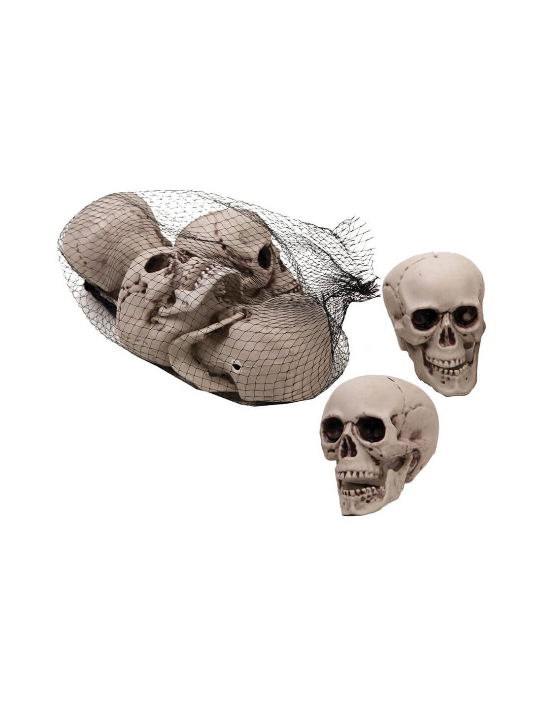 Calaveras Halloween que incluye un saco con 6 calaveras de plástico que miden 8x9cm aproximadamente.