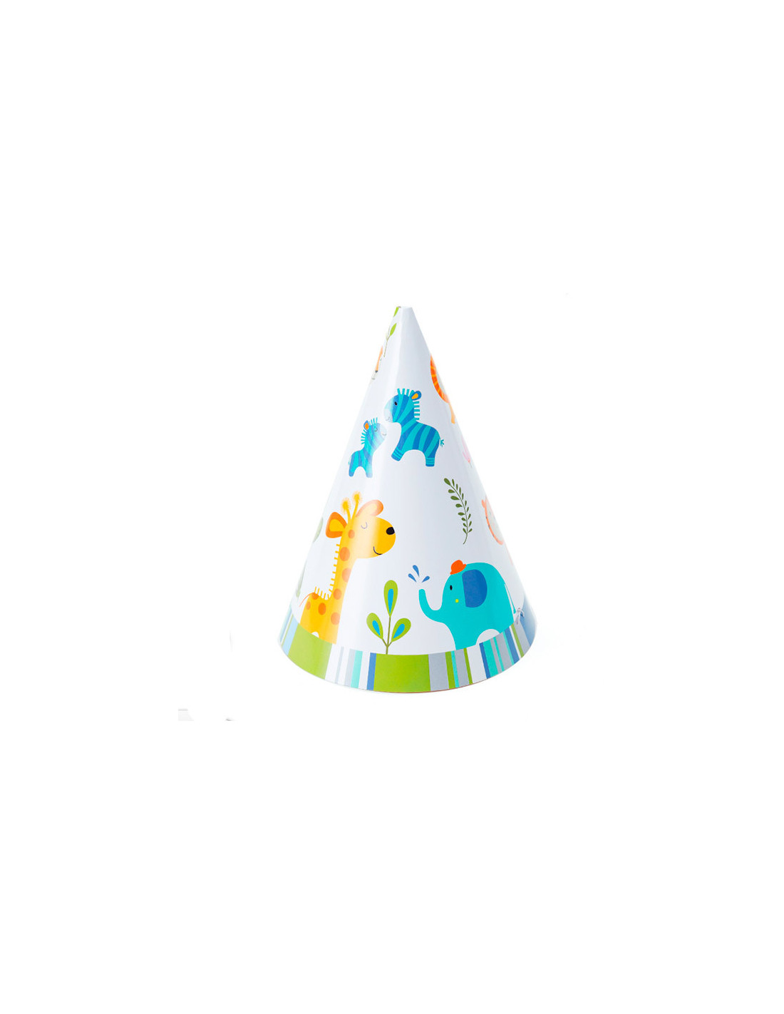 Contiene 6 gorros de cumpleaños zoo de cartón con goma elástica.