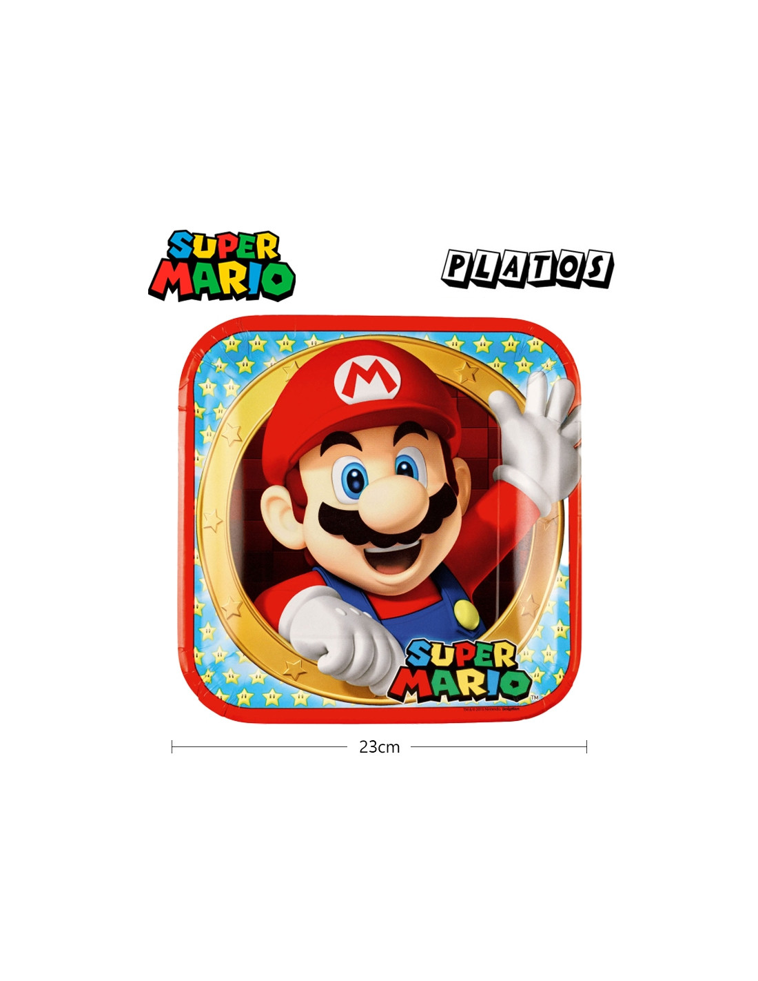Contiene 8 platos de Super Mario de cartón con la imagen de Mario. Miden 23x23cm aproximadamente.