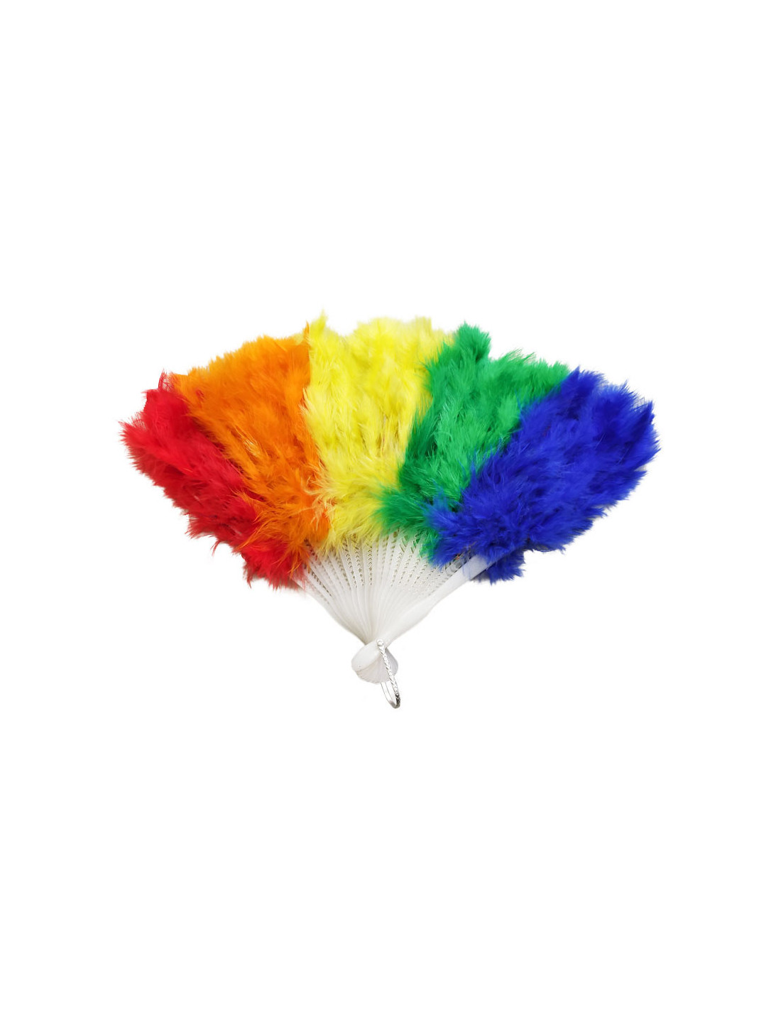 Precioso abanico multicolor de plumas para completar tu colorido look en Fiestas y Día del Orgullo Gay.