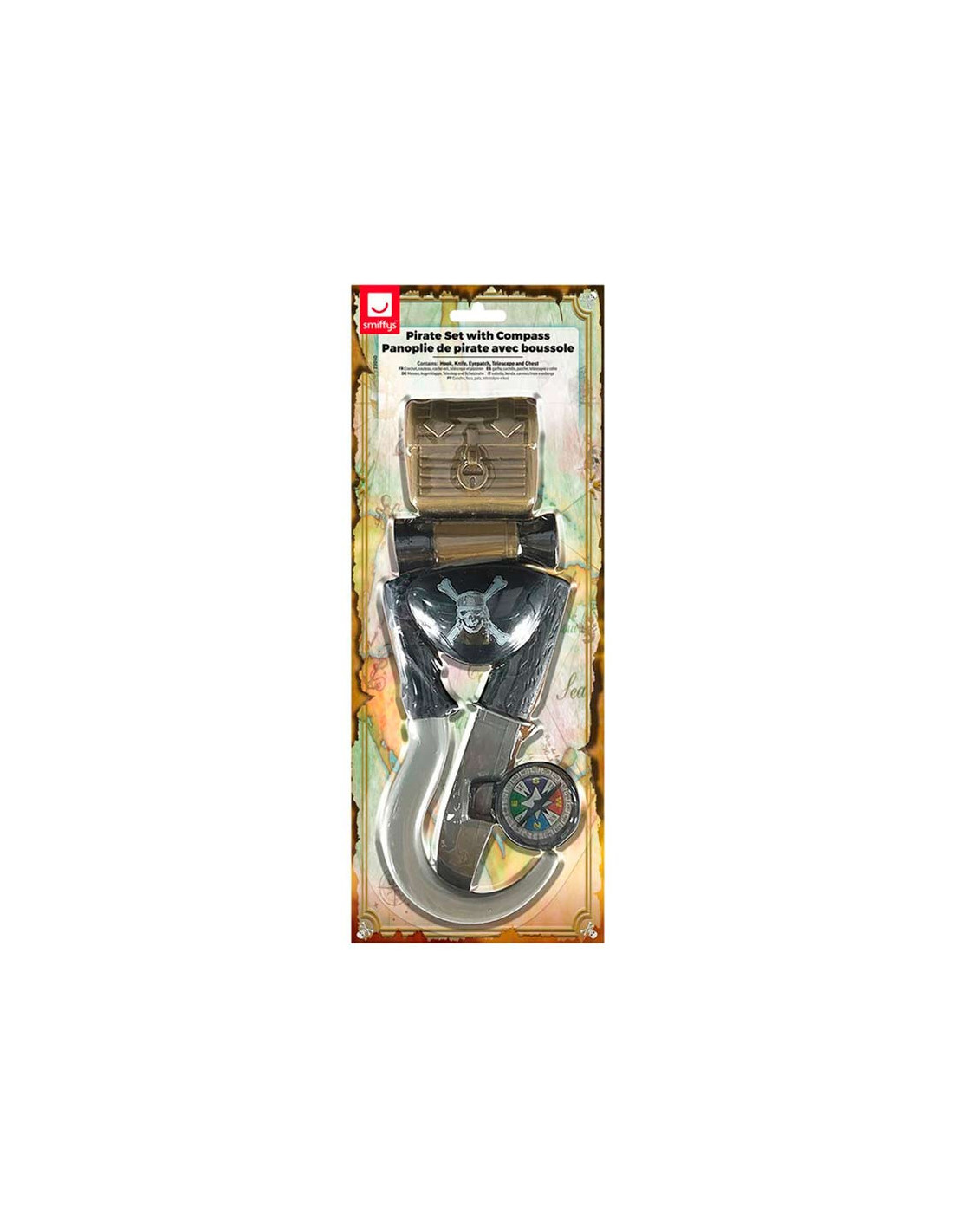 Los accesorios de pirata contienen brújula, garfio, cuchillo, parche de plástico, catalejo y pequeño cofre marrón.