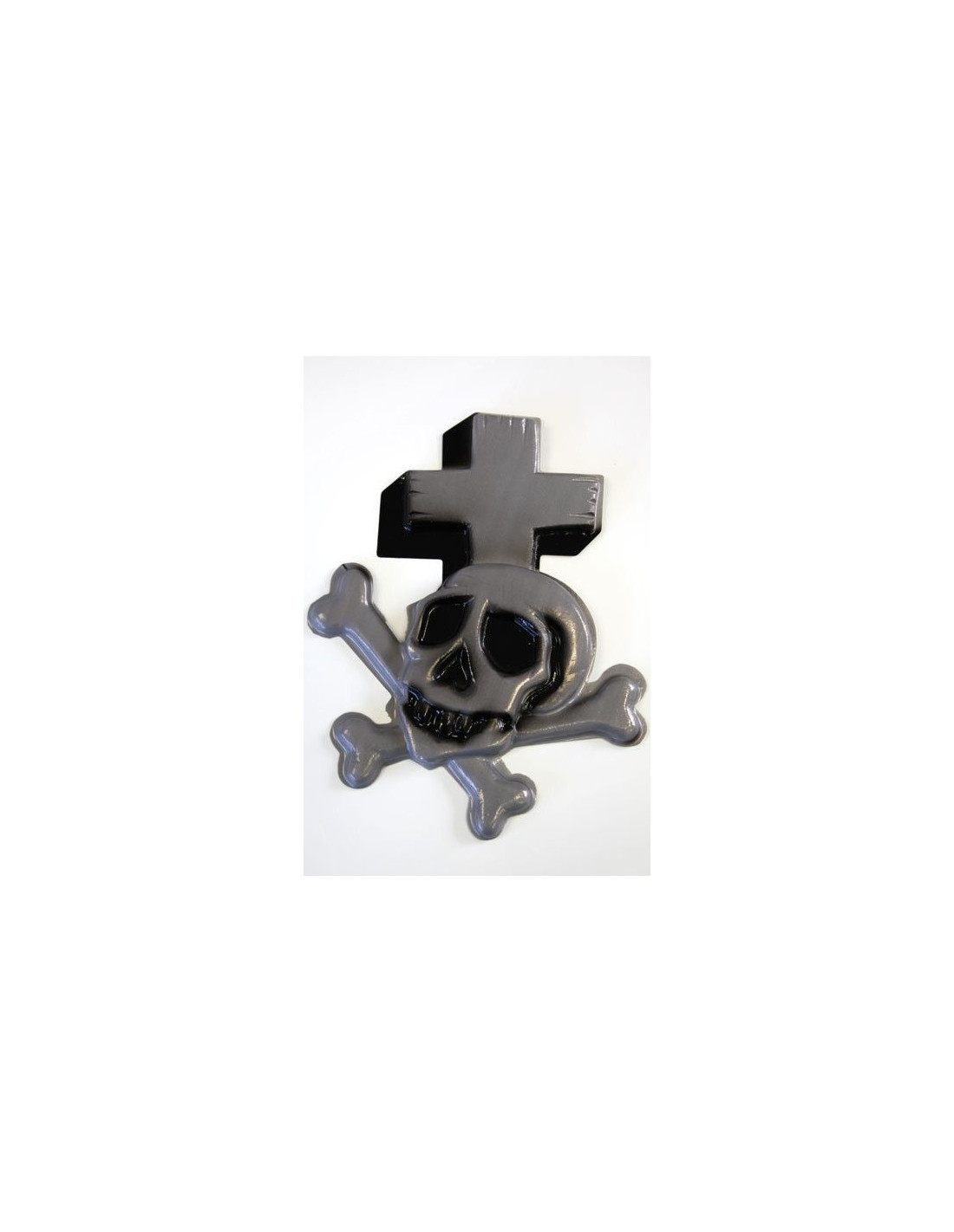 Adorno de calavera con cruz y huesos de color negro y gris. Esta fabricada en plastico termoconformado con unas medias de 26x22cm.