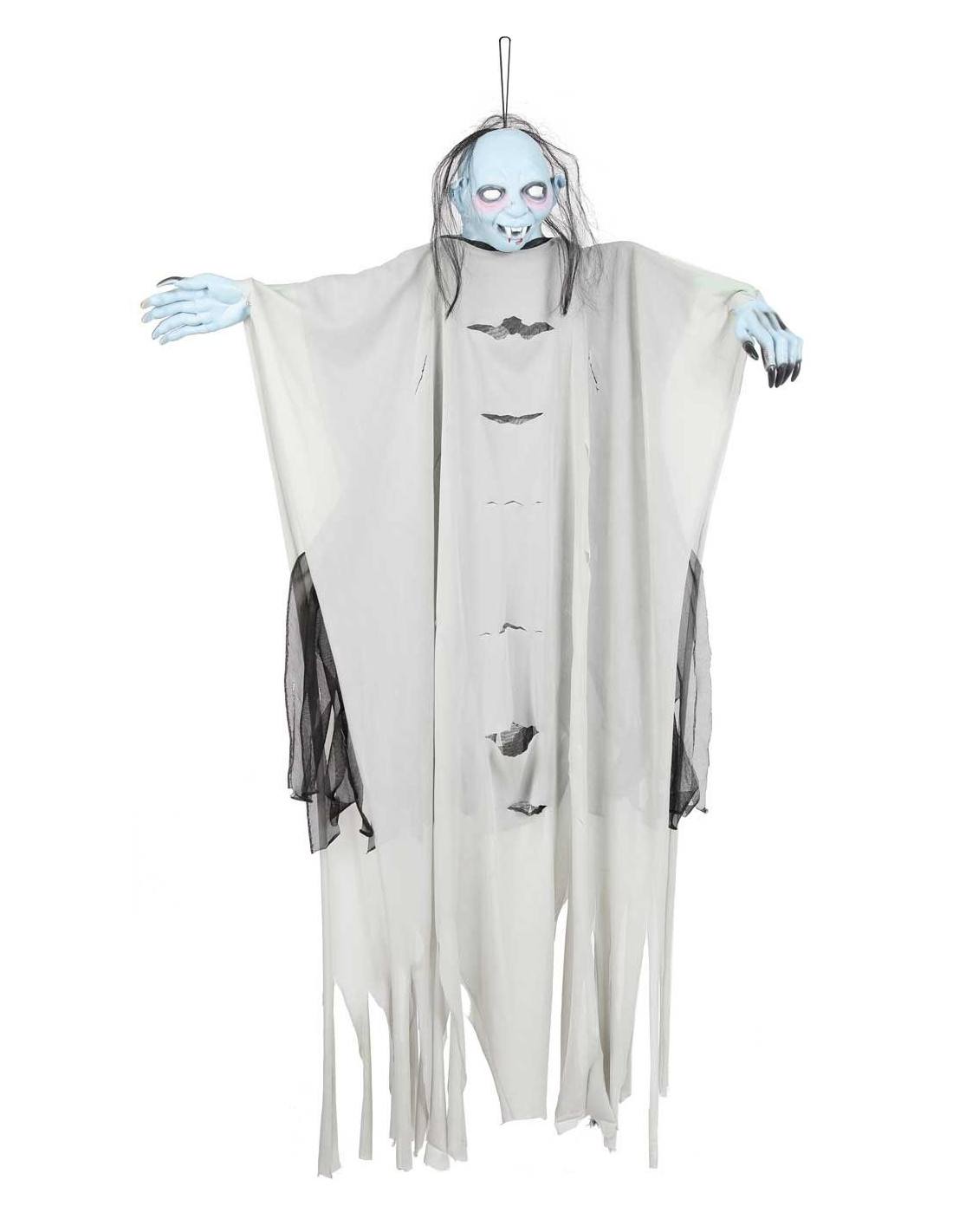 Colgante con cabeza y manos de pvc vestido con tunica de gasas para decorar en Halloween, medida 150x90 cm. por su tamaño es muy interesante para bares, locales o escaparates,