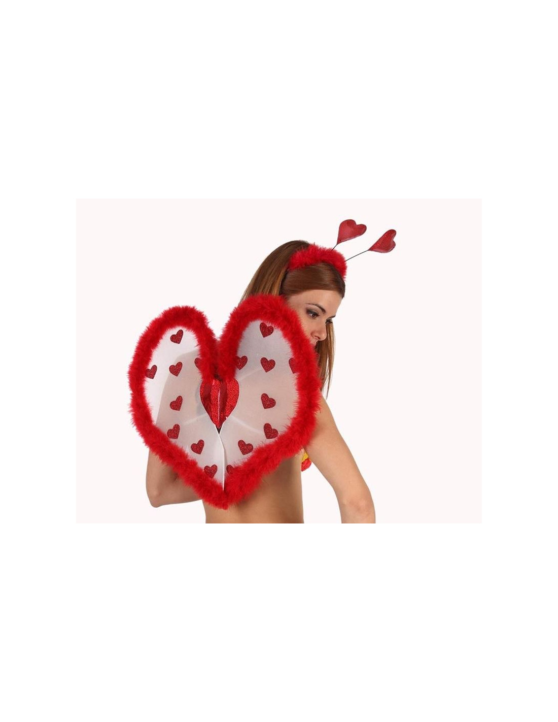 Conjunto de diadema y alas de gasa decorada con marabu rojo en su perimetro y corazones pegados