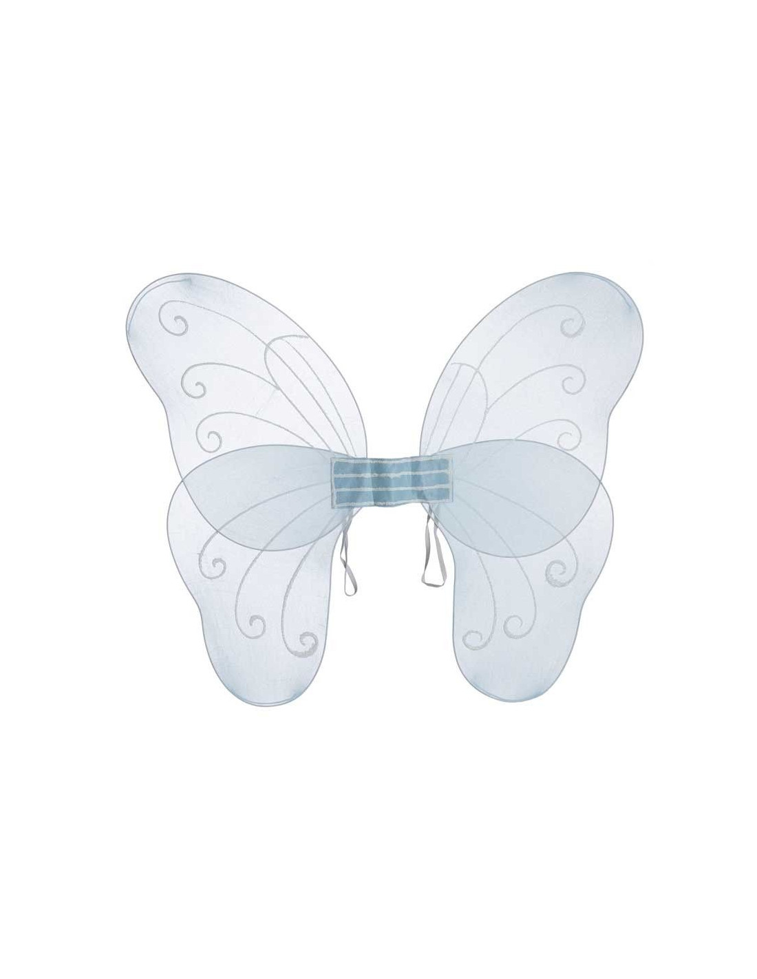 Alas de Hada en tono azul claro fabricadas de tela de gasa decorada y tensada sobre un soporte de alambre. Dimensiones de 54 x 56 cm.