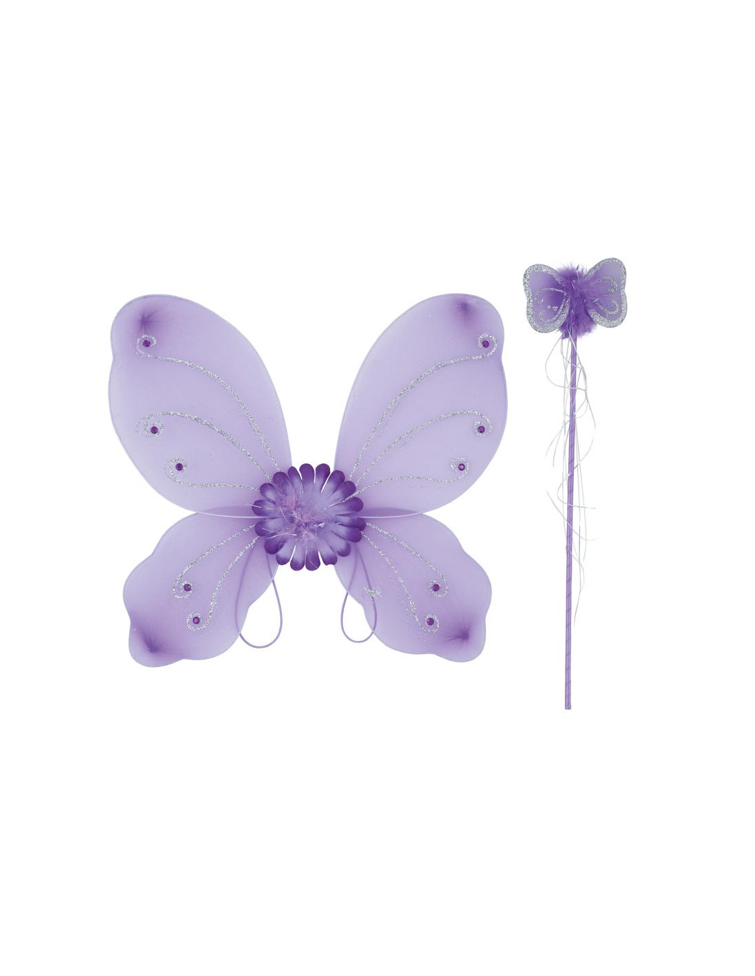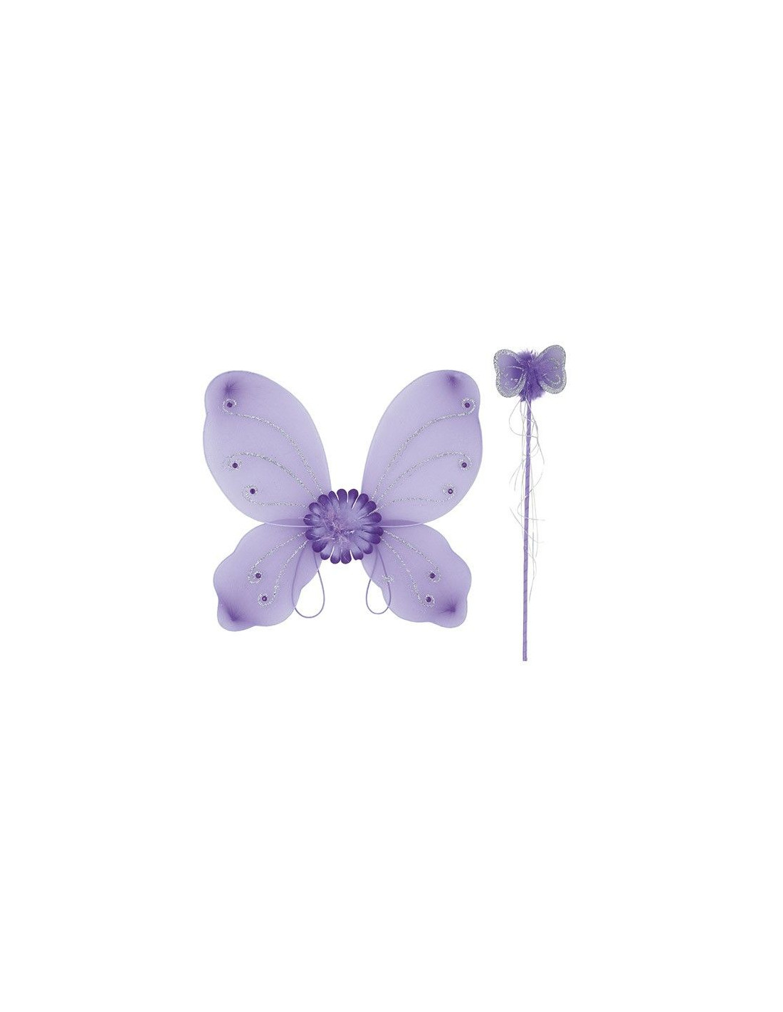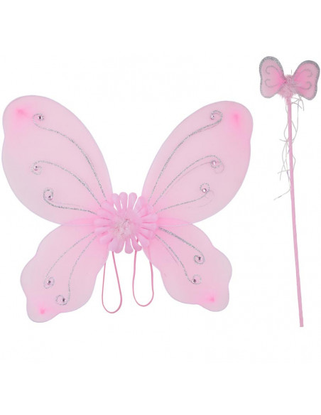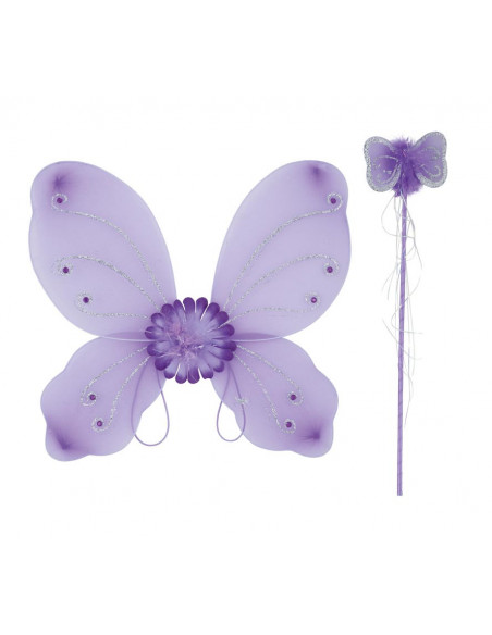 Alas de mariposa y varita disponibles en color morado y rosa. Las alas tienen unas medidas ed 43x39cm y la varita mide 47cm.