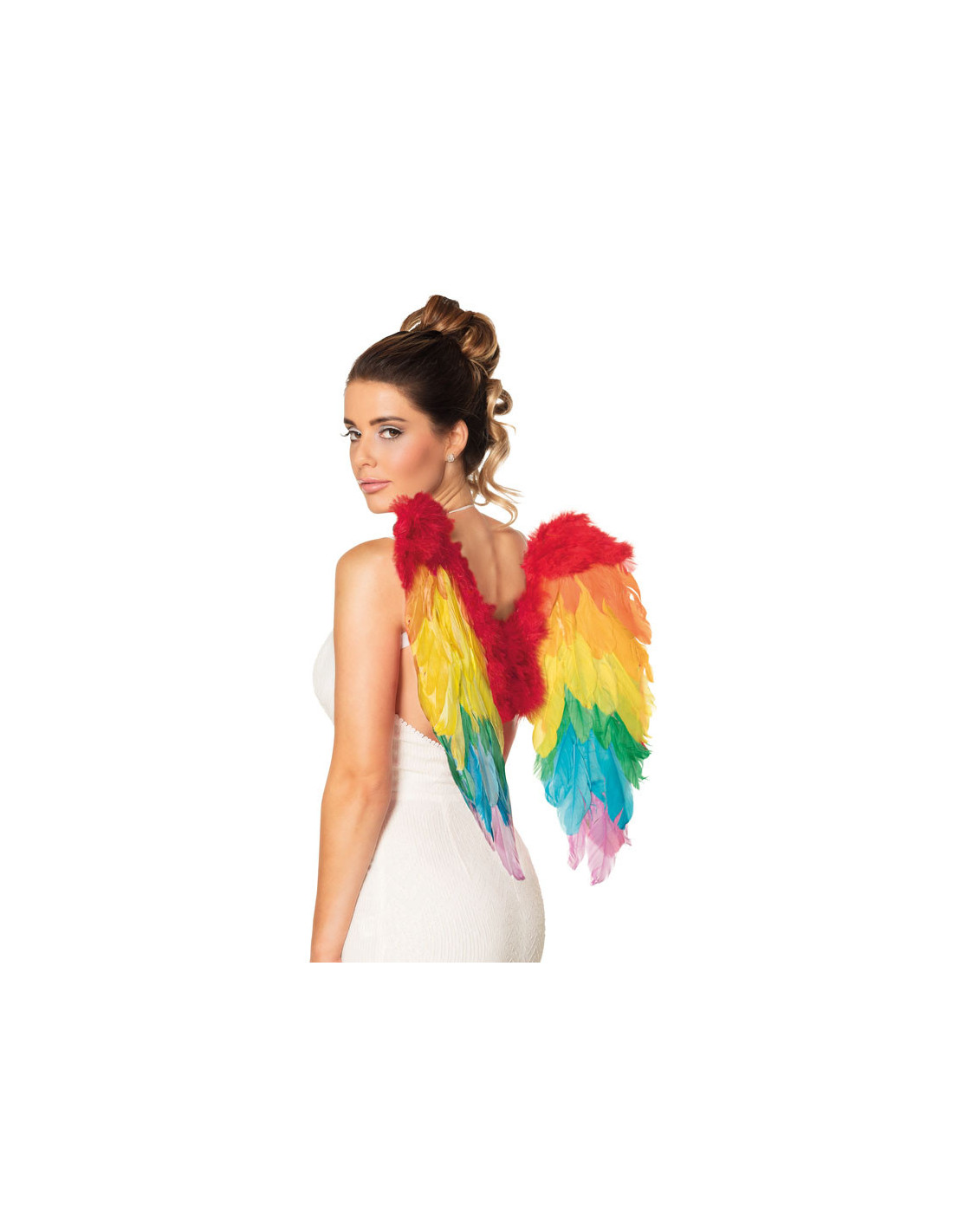 Alas multicolor que incluye unas alas de plumas con los colores del arco iris y unas medidas de 50x50cm.