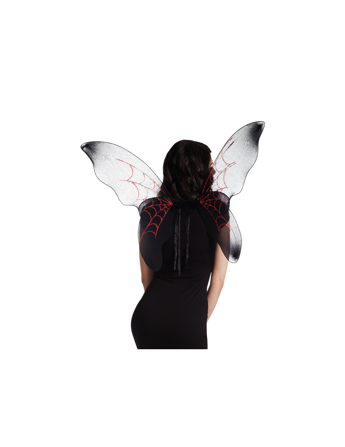 Estas alas son de color negro, de tela y con purpurina roja formando telas de araña. Tienen un tamaño de 62x62 cm.
