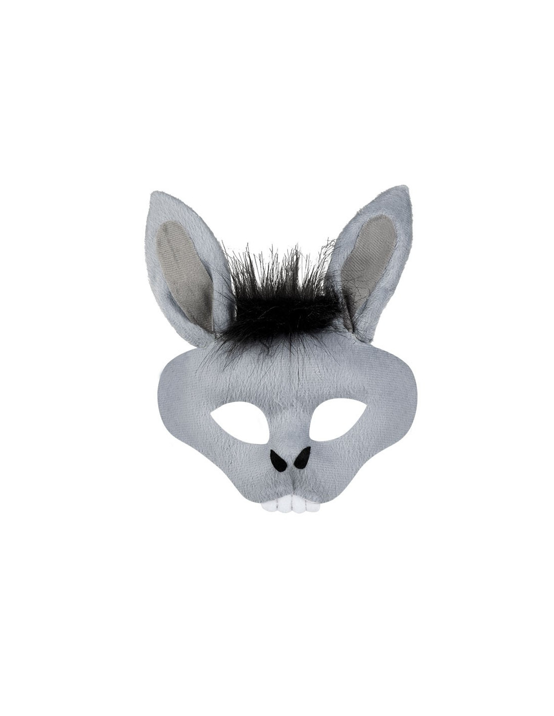 Antifaz de burro con dos orificios en los ojos para ver y morro con dientes para dar un mayor realismo. Esta media máscara es rígida y tiene relieve pero viene cubierta por fieltro gris y pelo en la zona superior. Las orejas son de tela y están acolchadas. El antifaz se sujeta con una goma elástica.