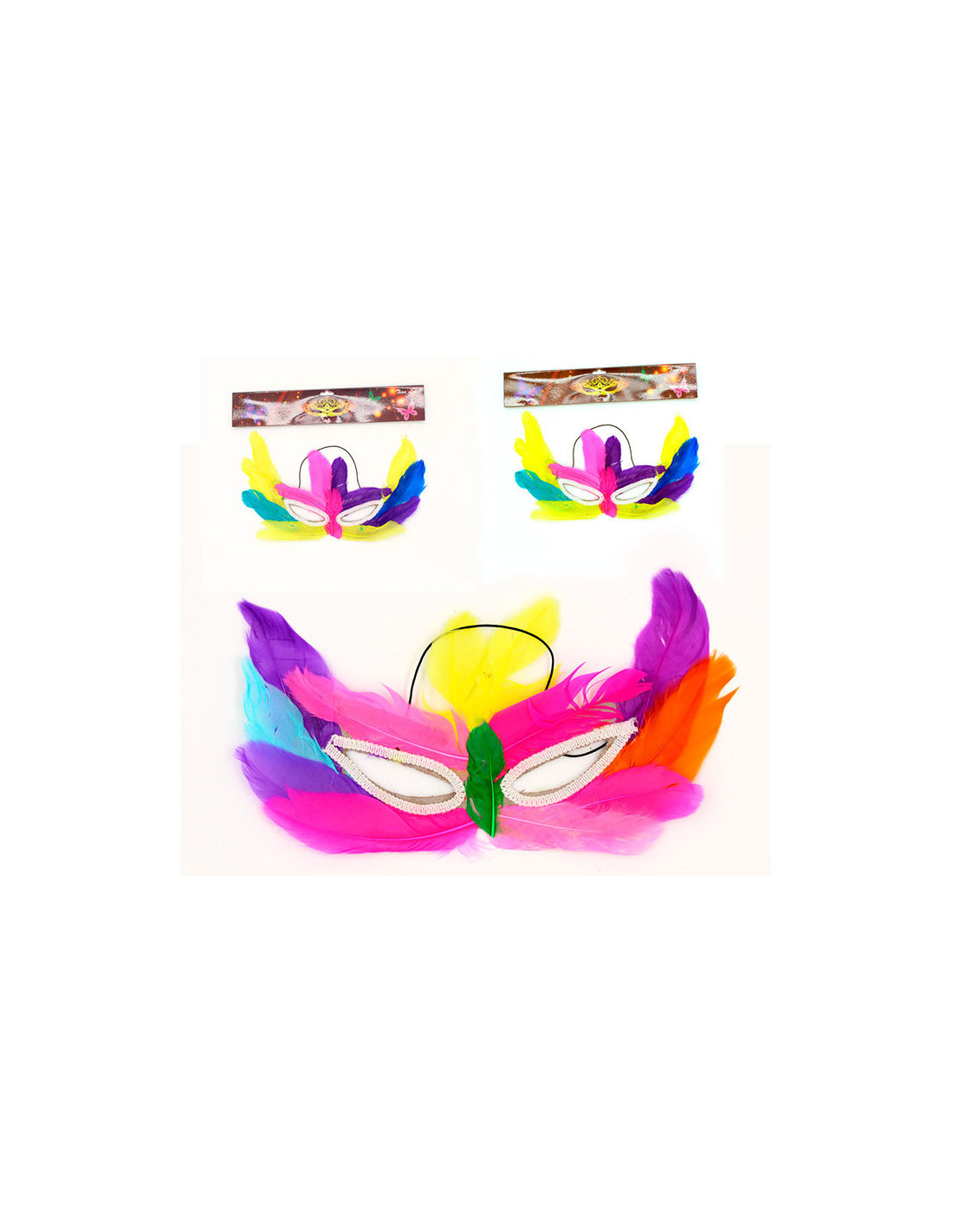 Contiene un antifaz con plumas de colores surtidos y goma elástica para colocar.