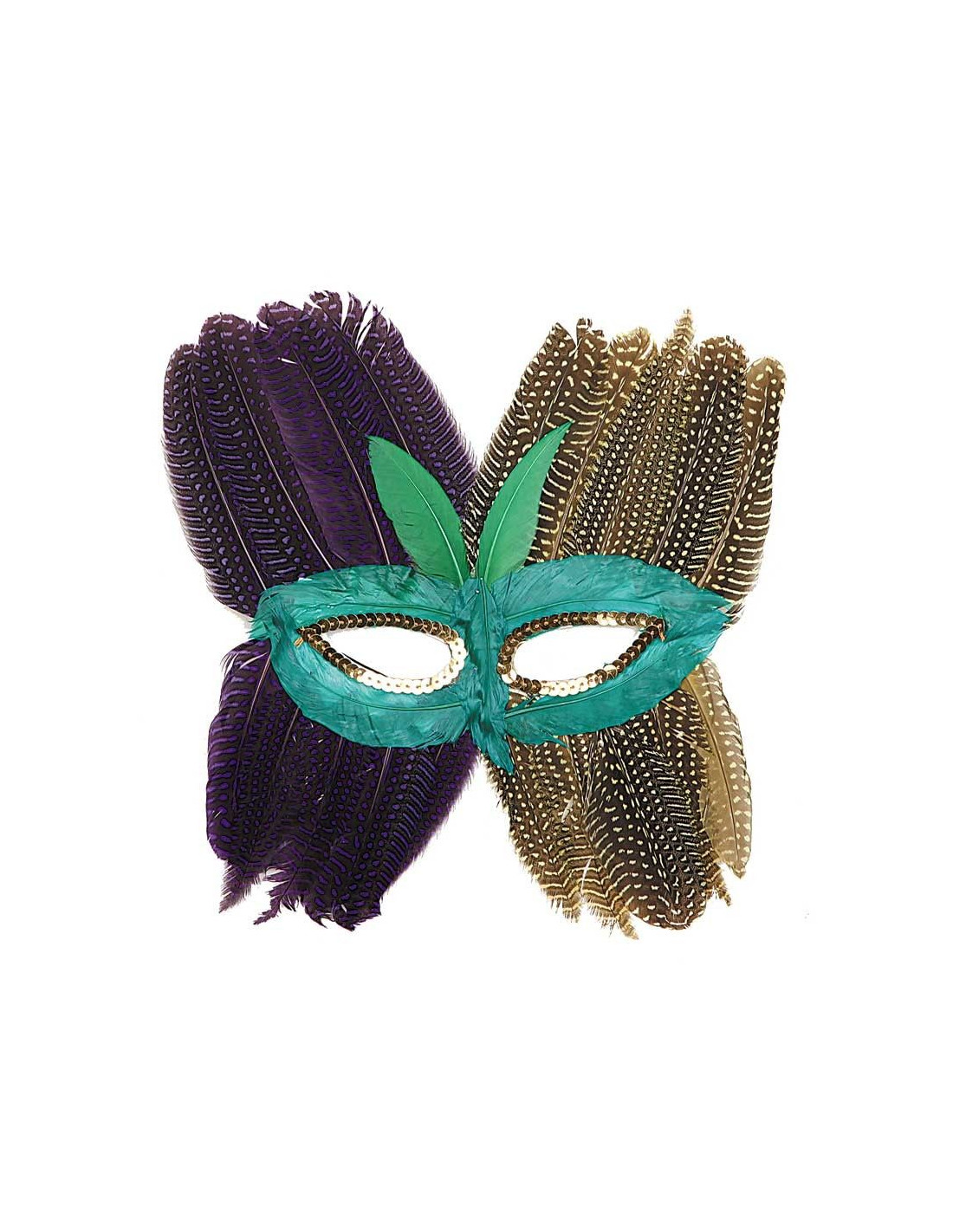 Antifaz de plumas reales para tu fiesta de Carnaval o bailes veneciano. Las plumas están adheridas a la base tanto en la parte superior como inferior, siendo moradas las de un lado y marrones las del otro.