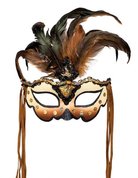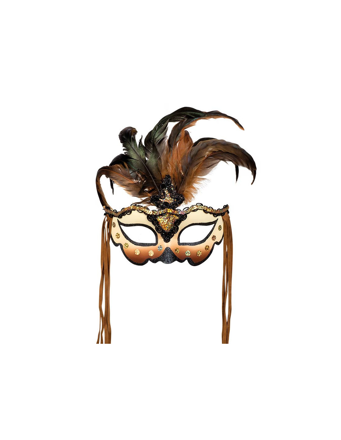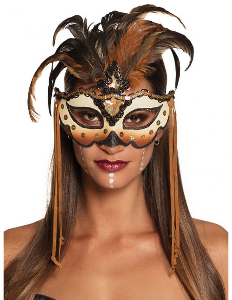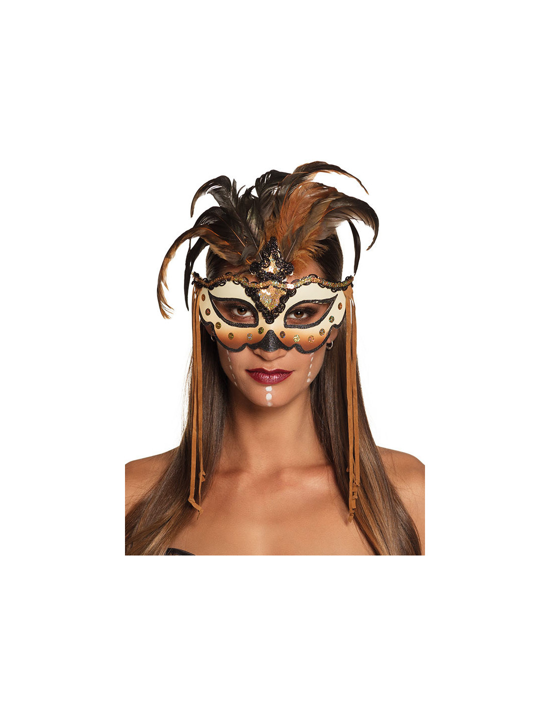 Antifaz étnico Vudú que incluye un antifaz con plumas y cintas colgando en los laterales.