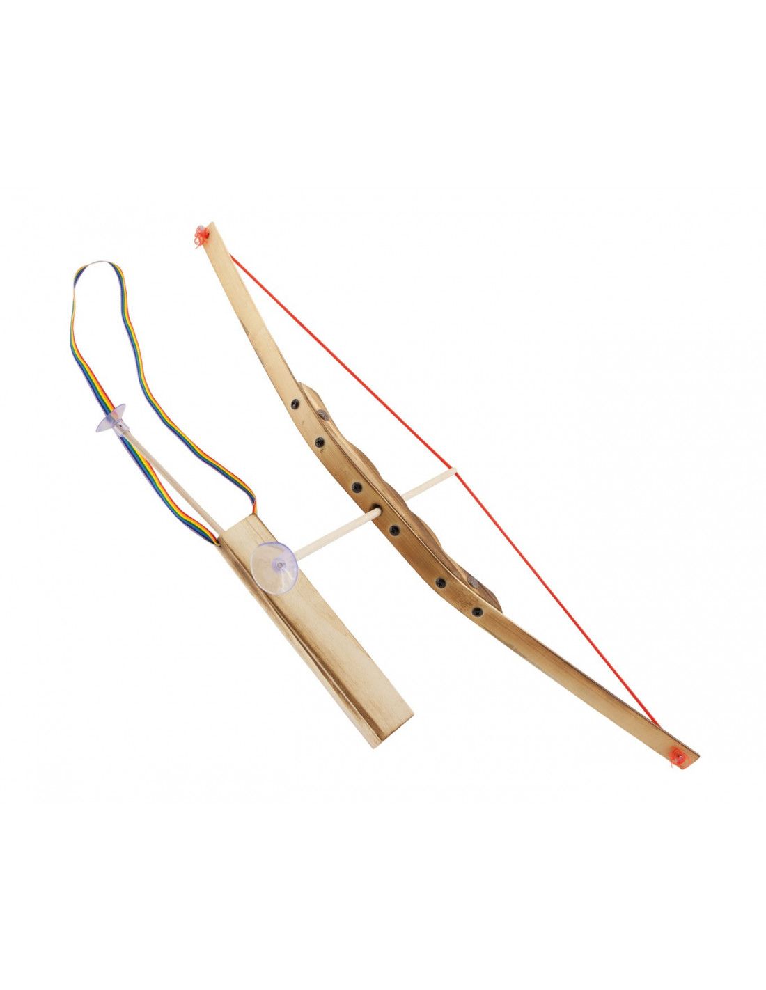Incluye arco hecho de madera con 60cm, dos flechas con ventosa y un carcaj de madera con una cinta.