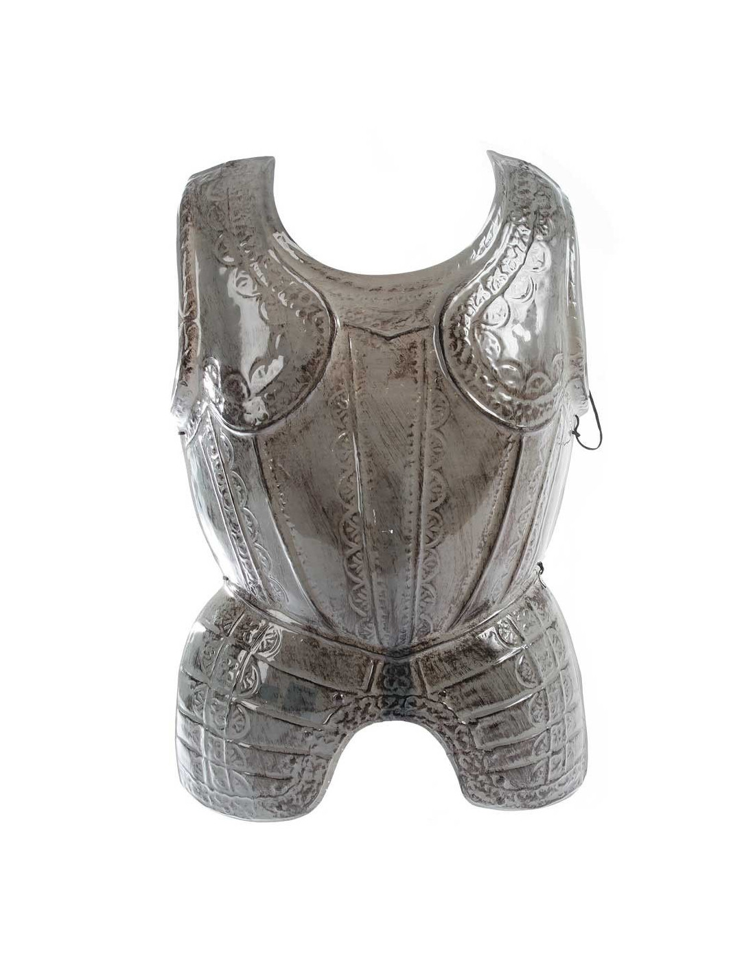 Complementa tu disfraz de caballero medieval con esta armadura de conquistador. Fabricada en plástico de pvc flexible. Incluye realista armadura de conquistador español con dibujos en relieve. Disponible en color gris-plata.