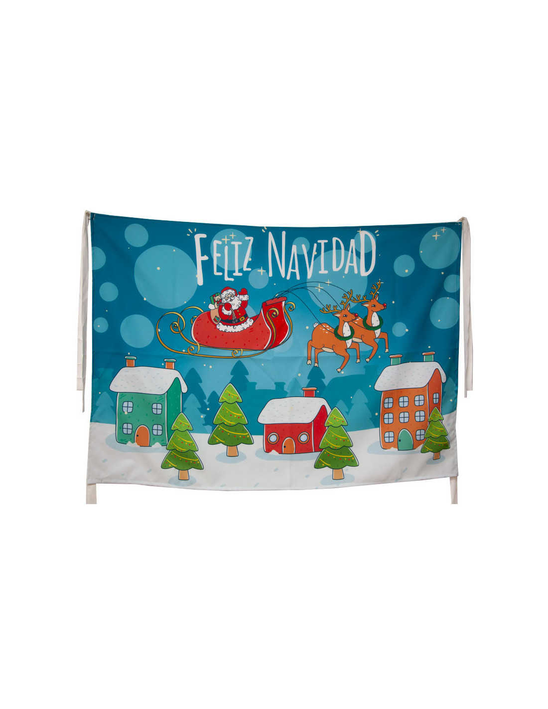 Balconera Navidad Papá Noel ciudad que contiene una pancarta de tela que mide 100 x 70cm aproximadamente con cintas en todos los extremos para sujetar en balcones.