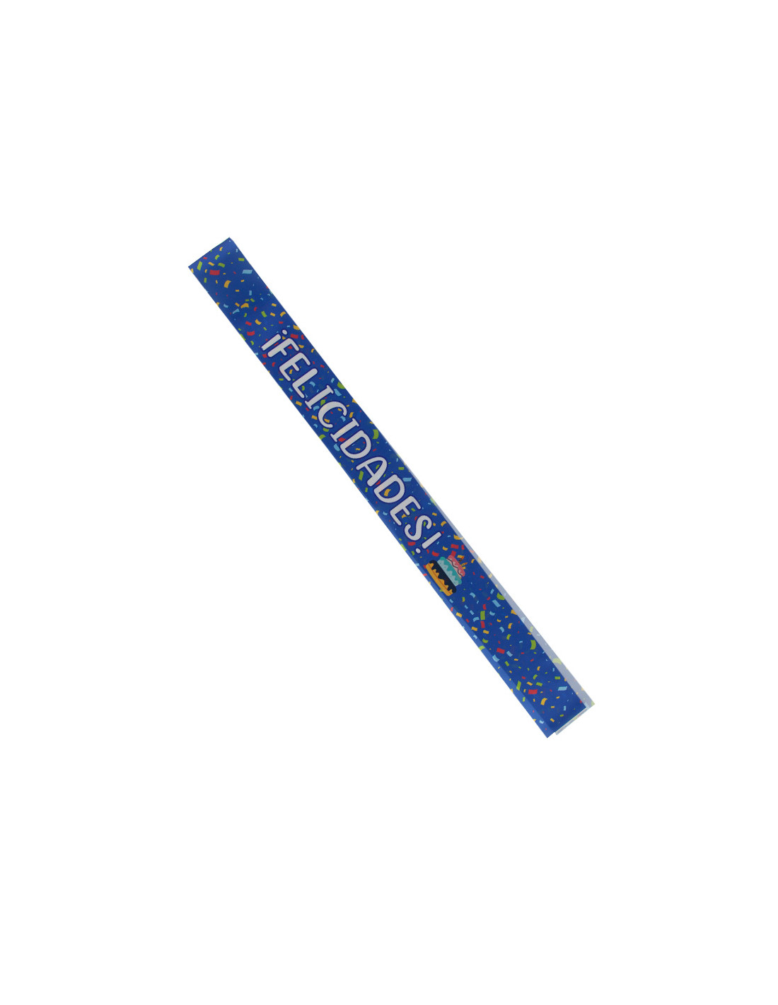 Esta banda de raso mide 2 metros de largo y 8,5cm de ancho. Su fondo es en color azul, estampada con un montón de confetti a lo largo de toda la banda y con el texto "¡Felicidades!" y la imagen de una tarta.