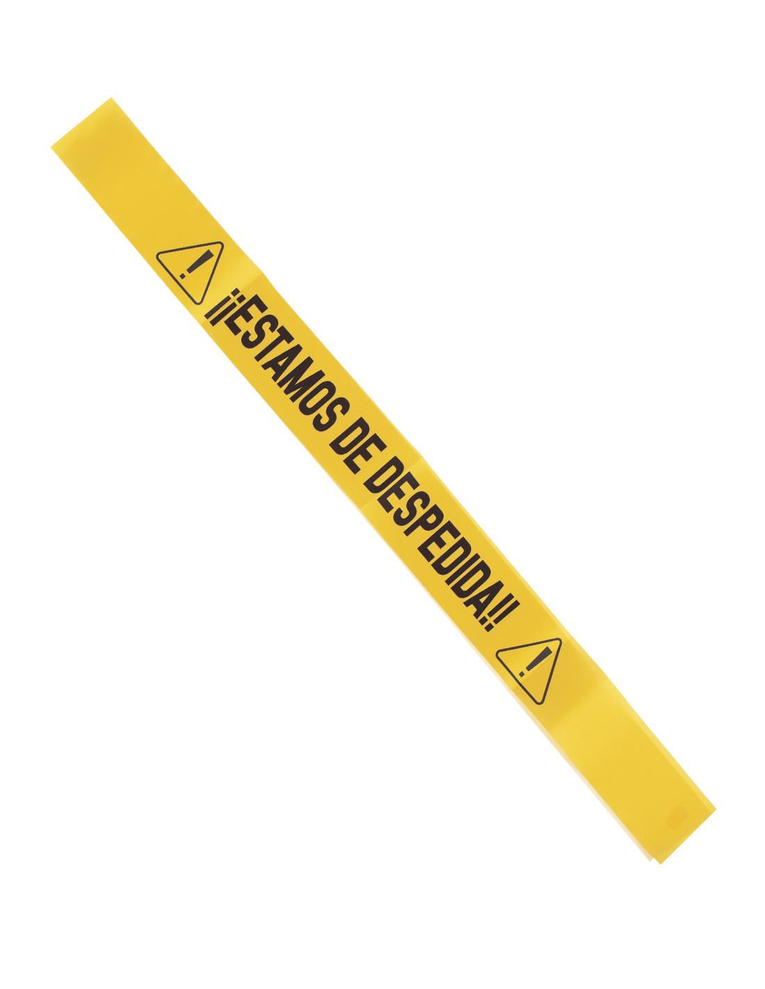 Esta original banda es de raso por lo que tiene un brillo muy bonito. Mide 8,5cm de ancho, 2 metros de longitud y está estampada con la frase ¡¡Estamos de despedida!! y dos símbolos de advertencia.