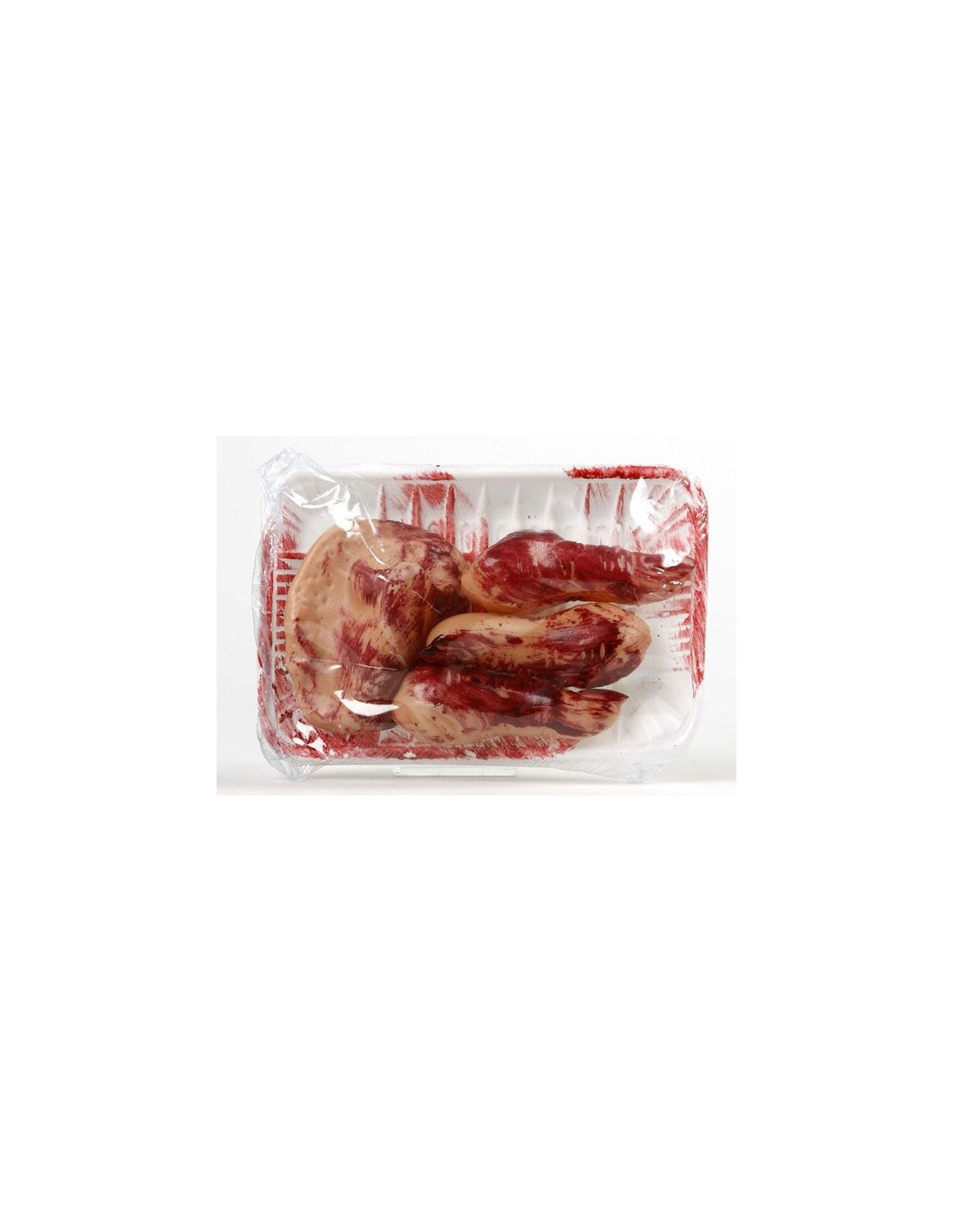 Bandeja de plastico blanca con varios miembros de plastico como dedos, orejas, narices... todo ello manchado con pintura roja imitando la sangre.