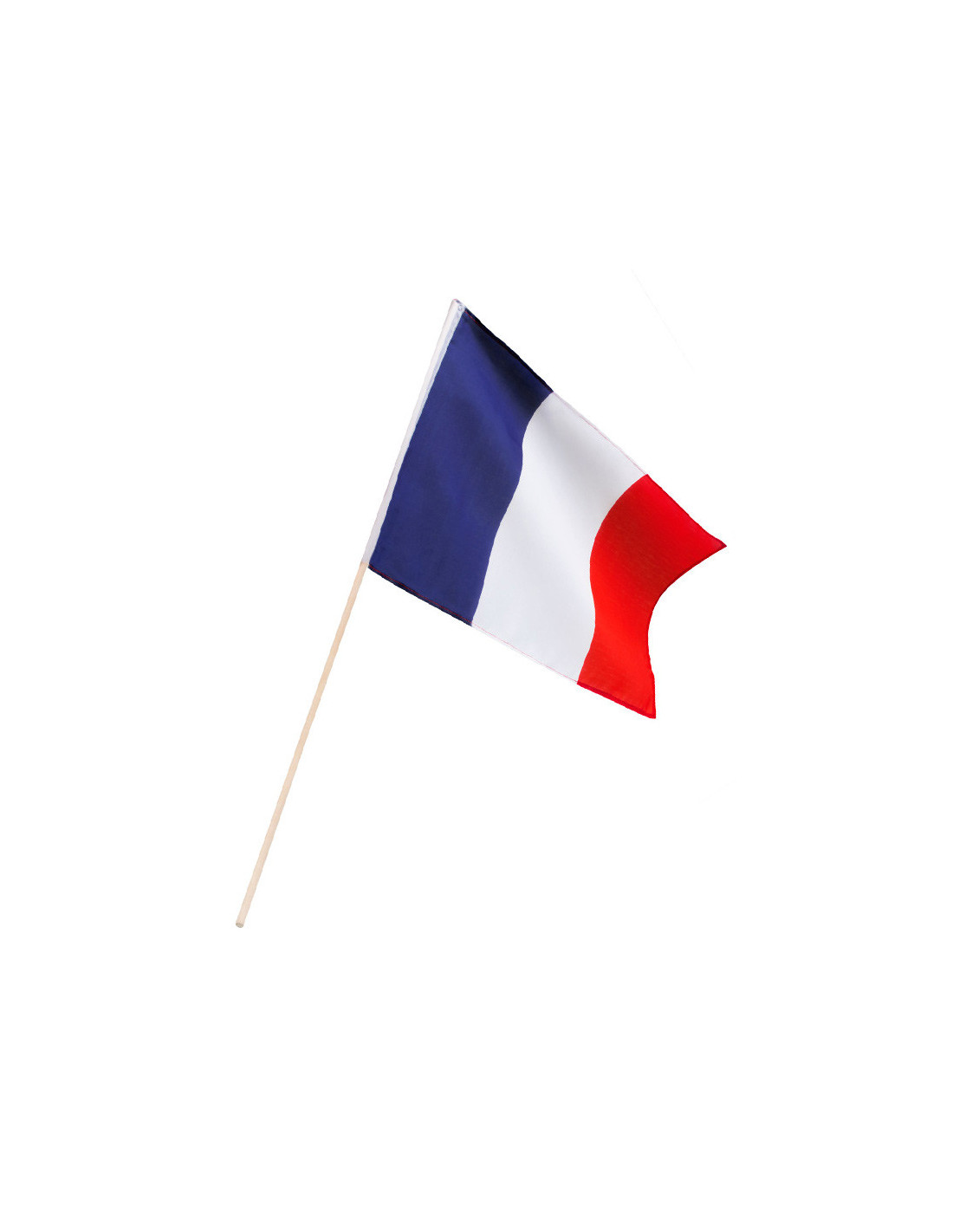 Contiene una bandera con los colores de Francia que mide 30x45cm y 76cm de alto con el palo de madera incluido.
