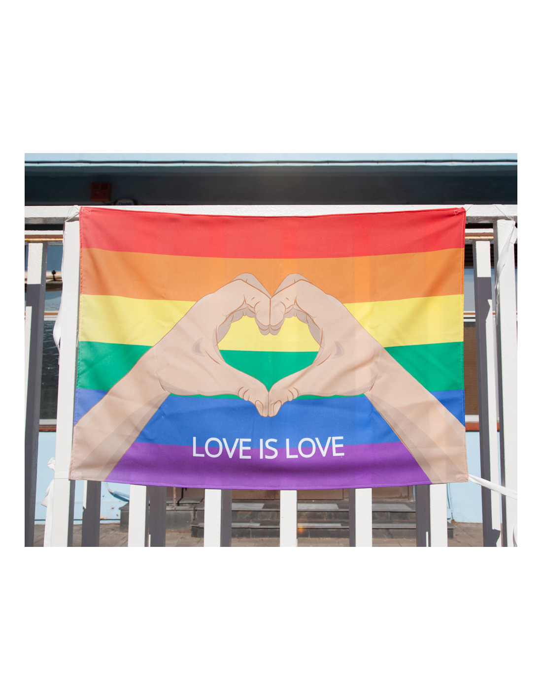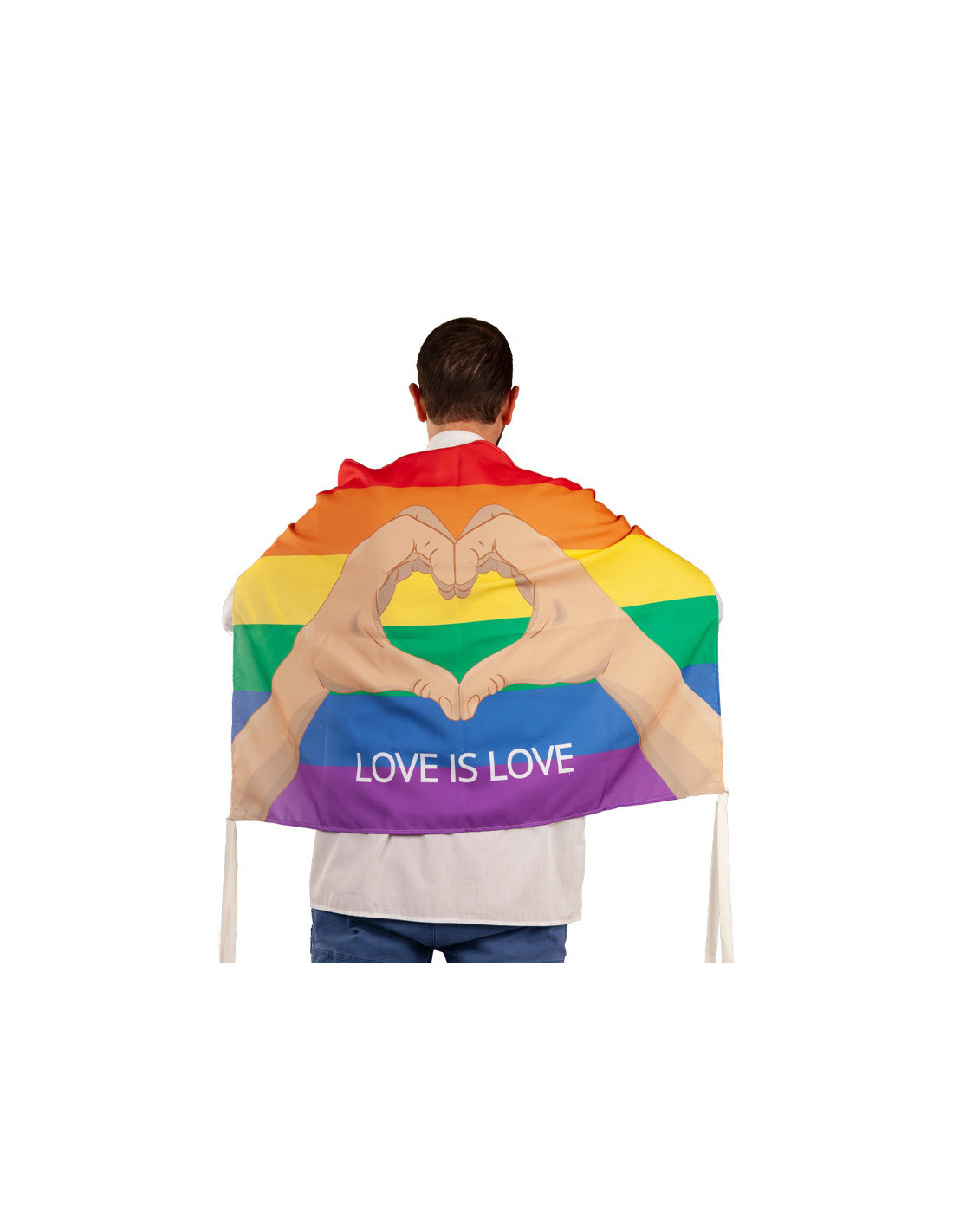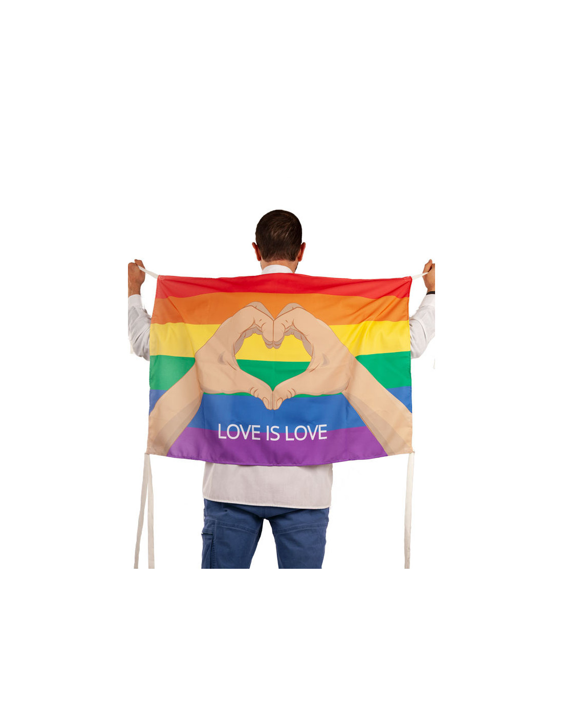 La bandera del Orgullo manos contiene una bandera de 100x70cm con dos cintas en cada esquina. De fondo tiene el estampado de los colores de la bandera gau y dos manos formando un corazón con la inscripción 'love is love'.