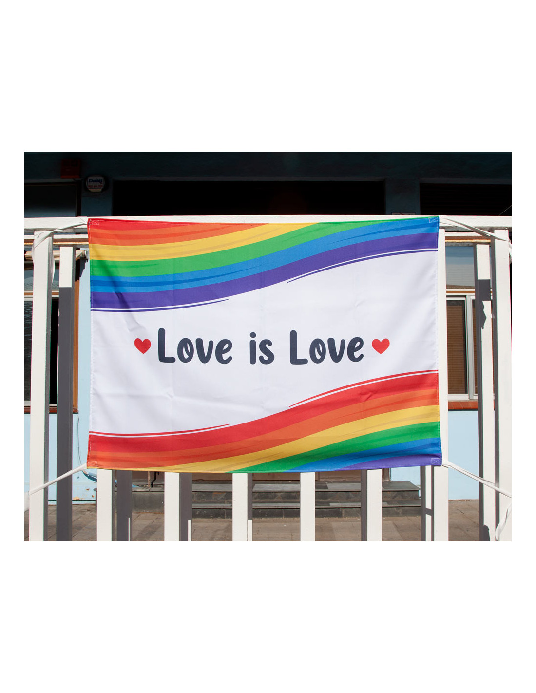 La bandera orgullo Love Is Love mide 100x70cm y tiene dos cintas en cada lateral para colgar.