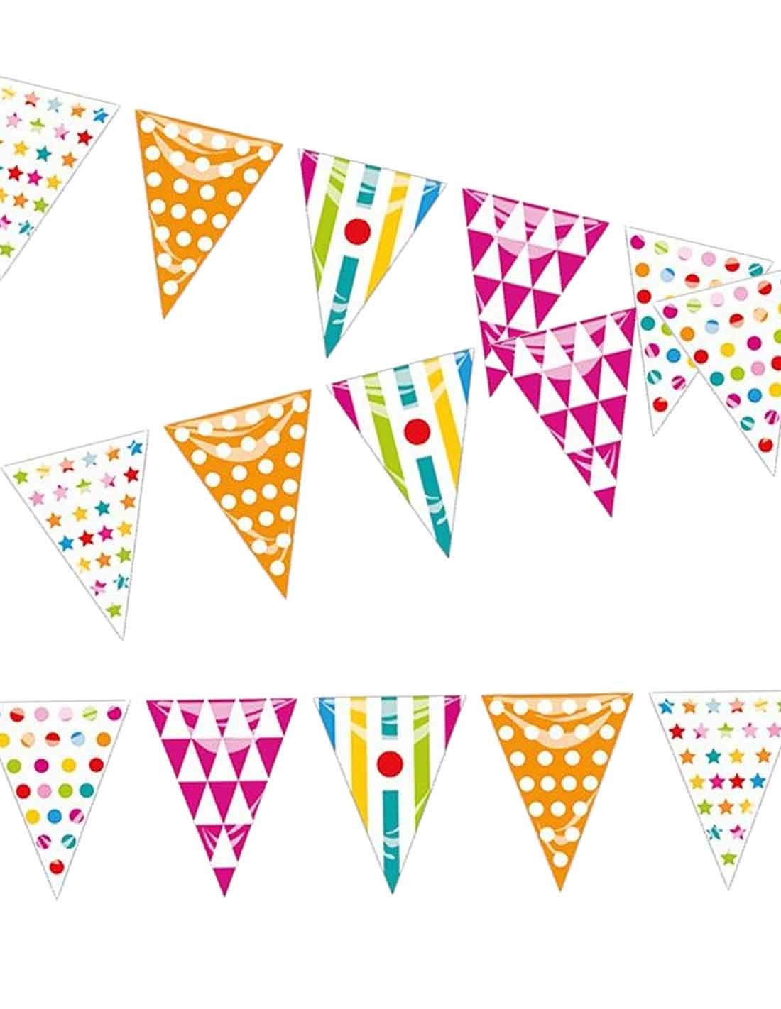 Banderín triangular de colores. Es de plástico y tiene unas medidas de 28x20cm aproximadamente. Cada banderín tiene unos colores y estampados diferentes, formando una tira de 15m. Aconsejadas para uso exterior.