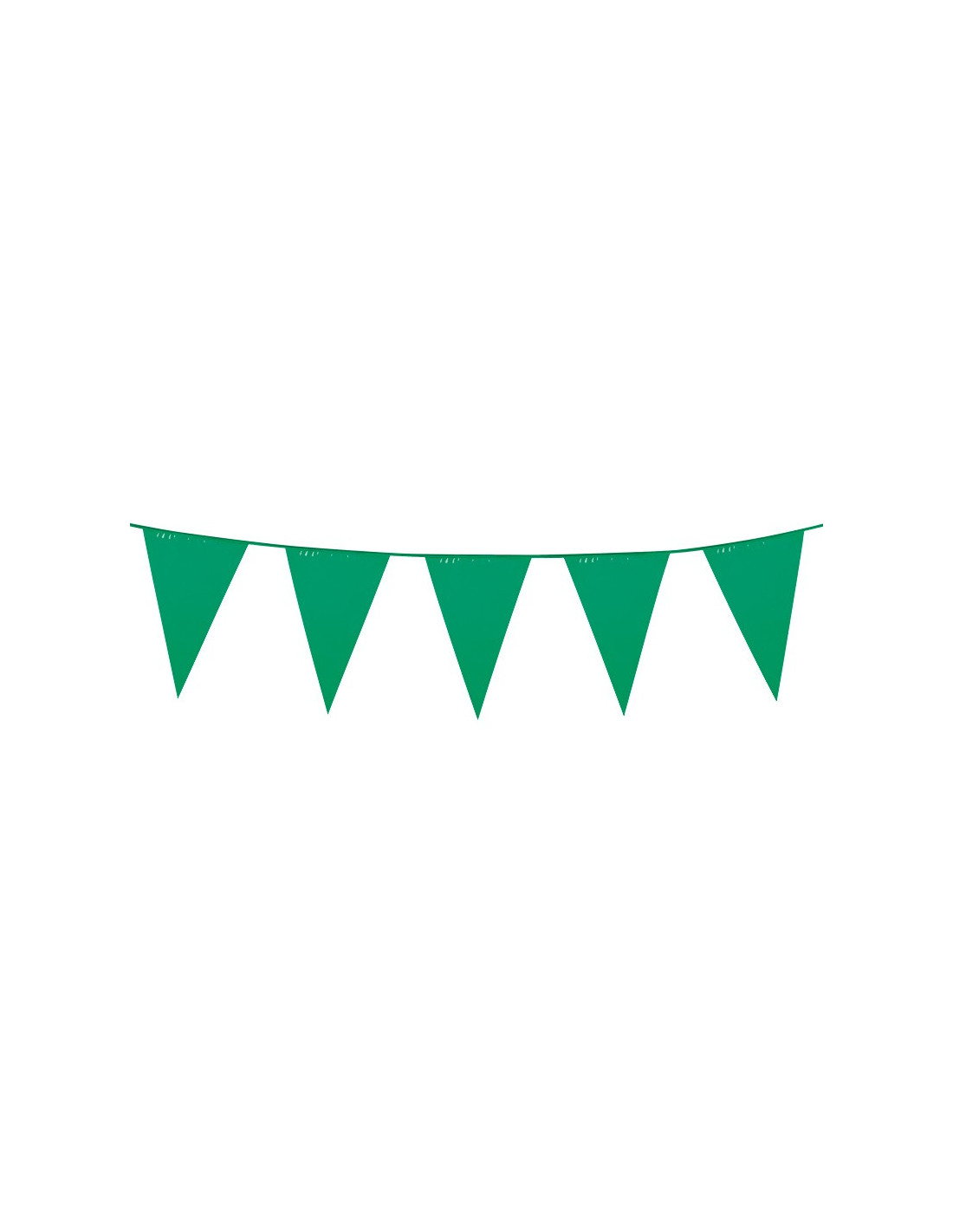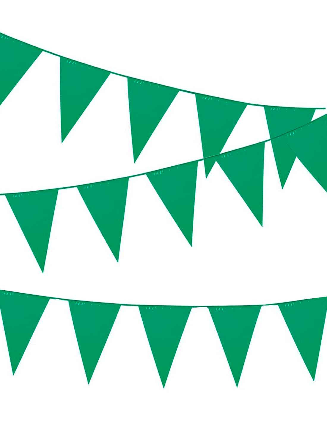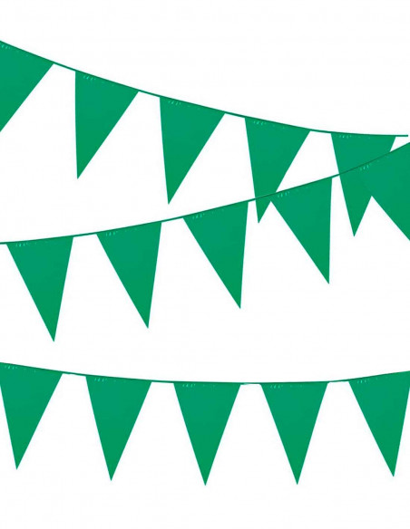 Banderín triangular verde que incluye una guirnalda de 10 metros de largo y banderines de 30x20cm.