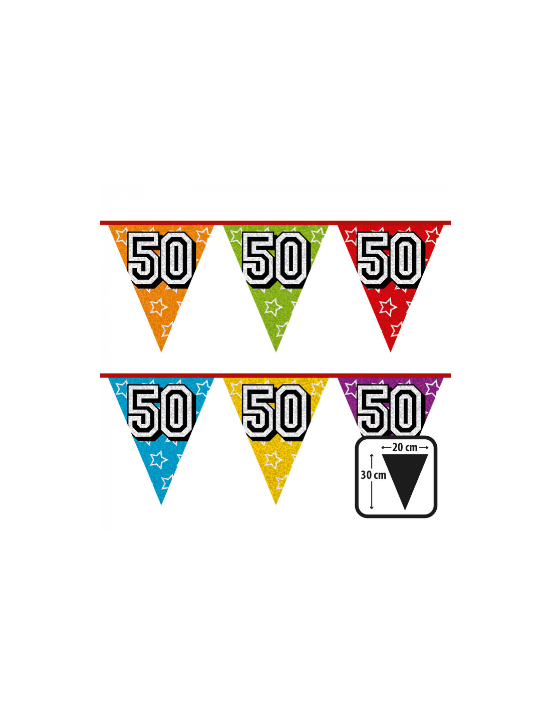 Esta guirnalda de banderines 50 aniversario mide 8 metros de largo y está compuesto por triángulos, con el número 50 estampado.