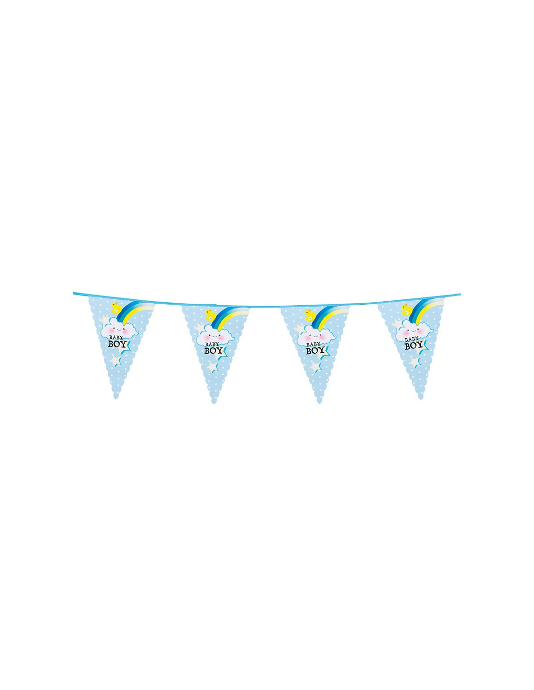 Banderines Baby Boy con una longitud de 6 metros. Contiene 15 banderines de 30x20cm de cartón.