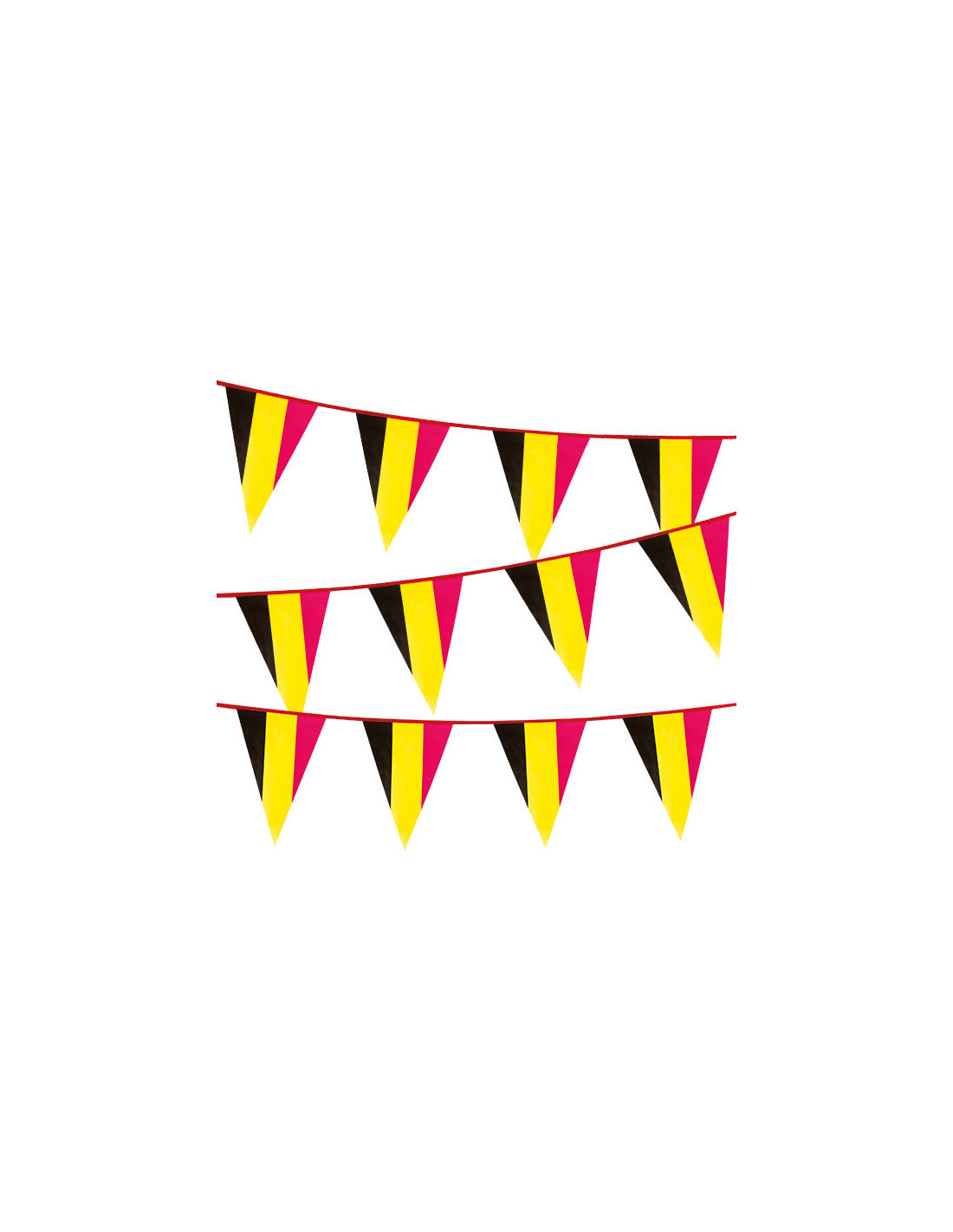 Esta guirnalda de banderines Bélgica mide alrededor de 10 metros de largo. Cada banderín triangular mide 20x30cm aproximadamente.
