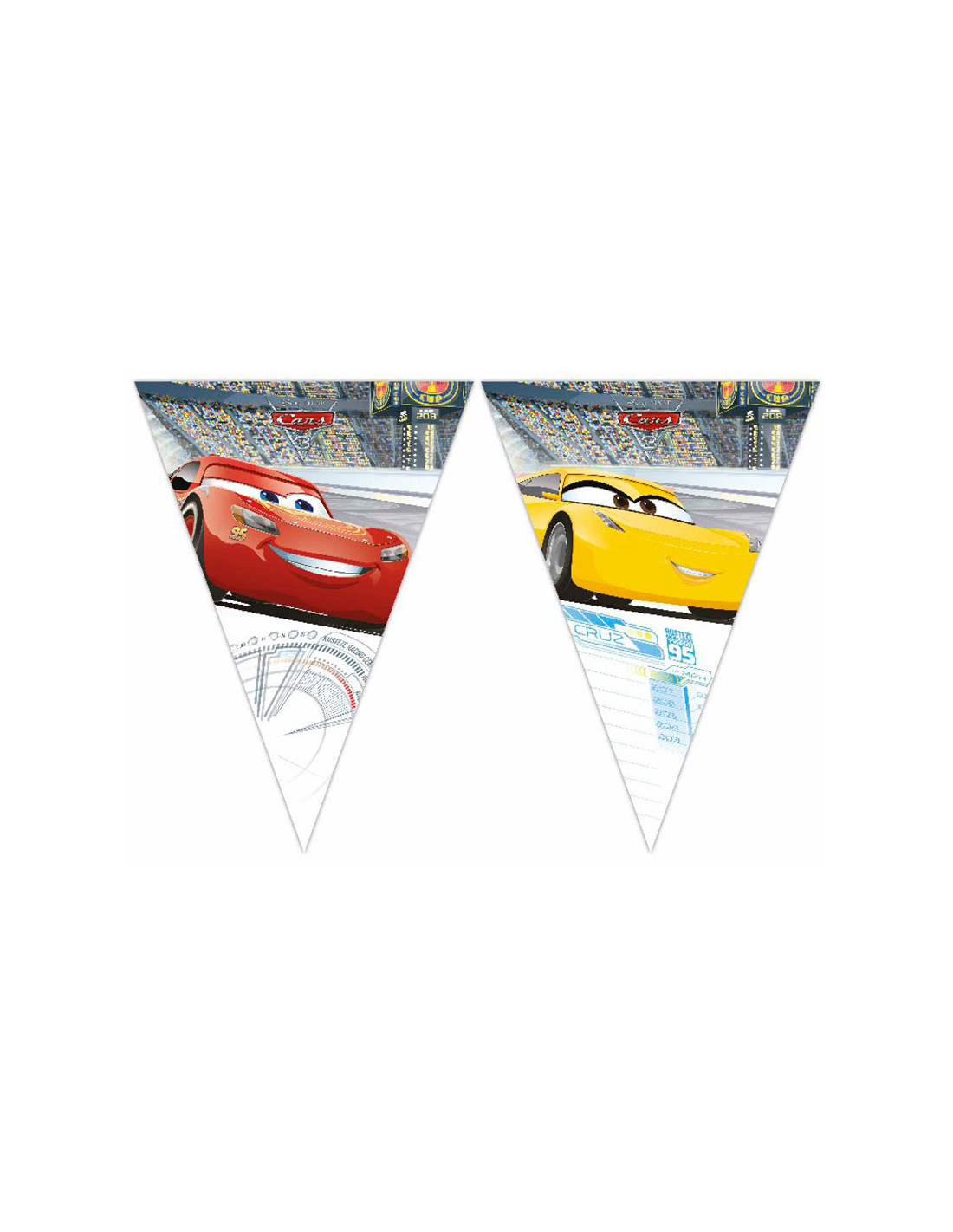 Banderines Cars que contiene una guirnalda de 3,60m de largo compuesta por 9 banderines de plástico estampados y 30cm de alto.