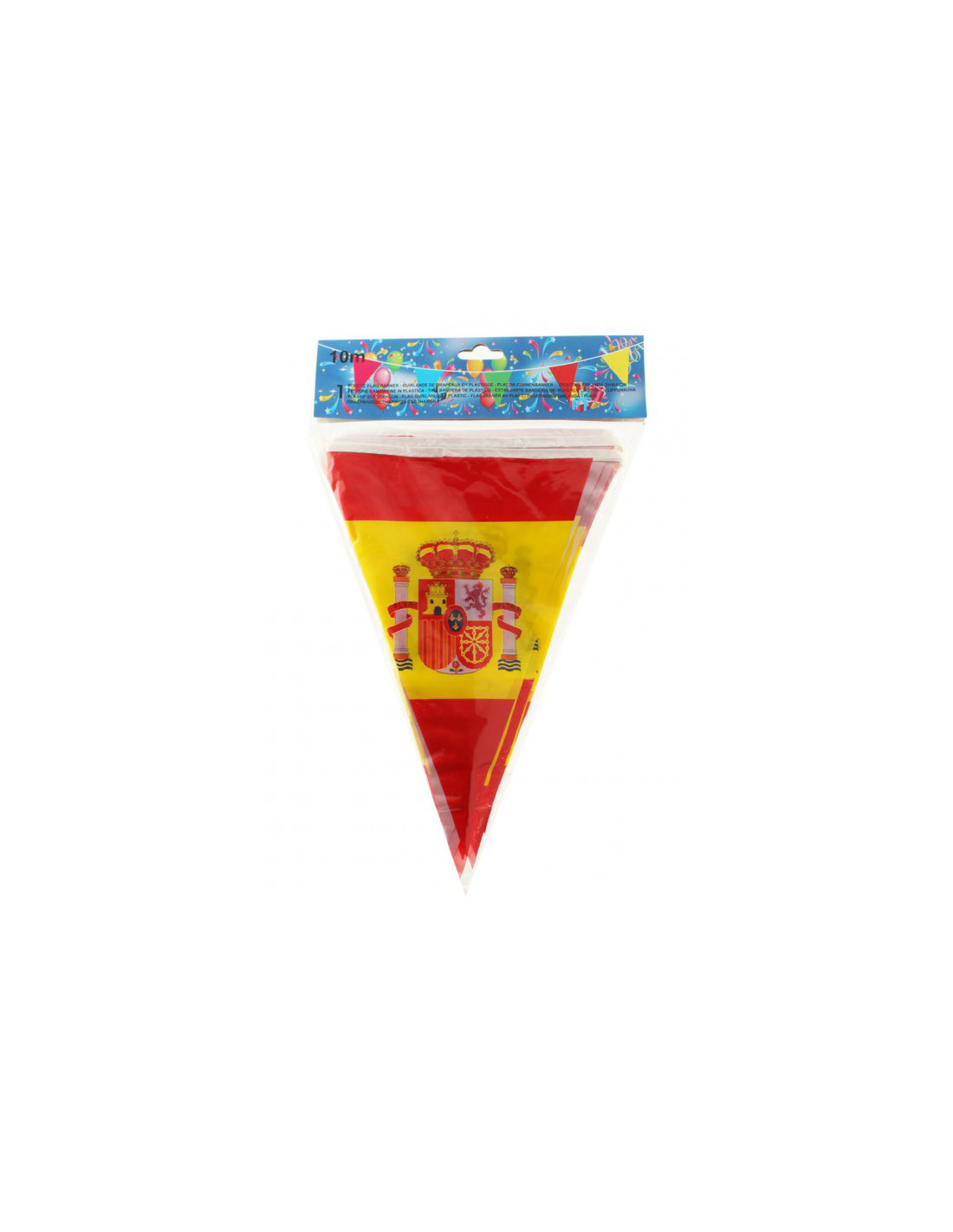 Banderines España de plástico que incluye una guirnalda de 10 metros de largo y banderines triangulares de 20x30cm.