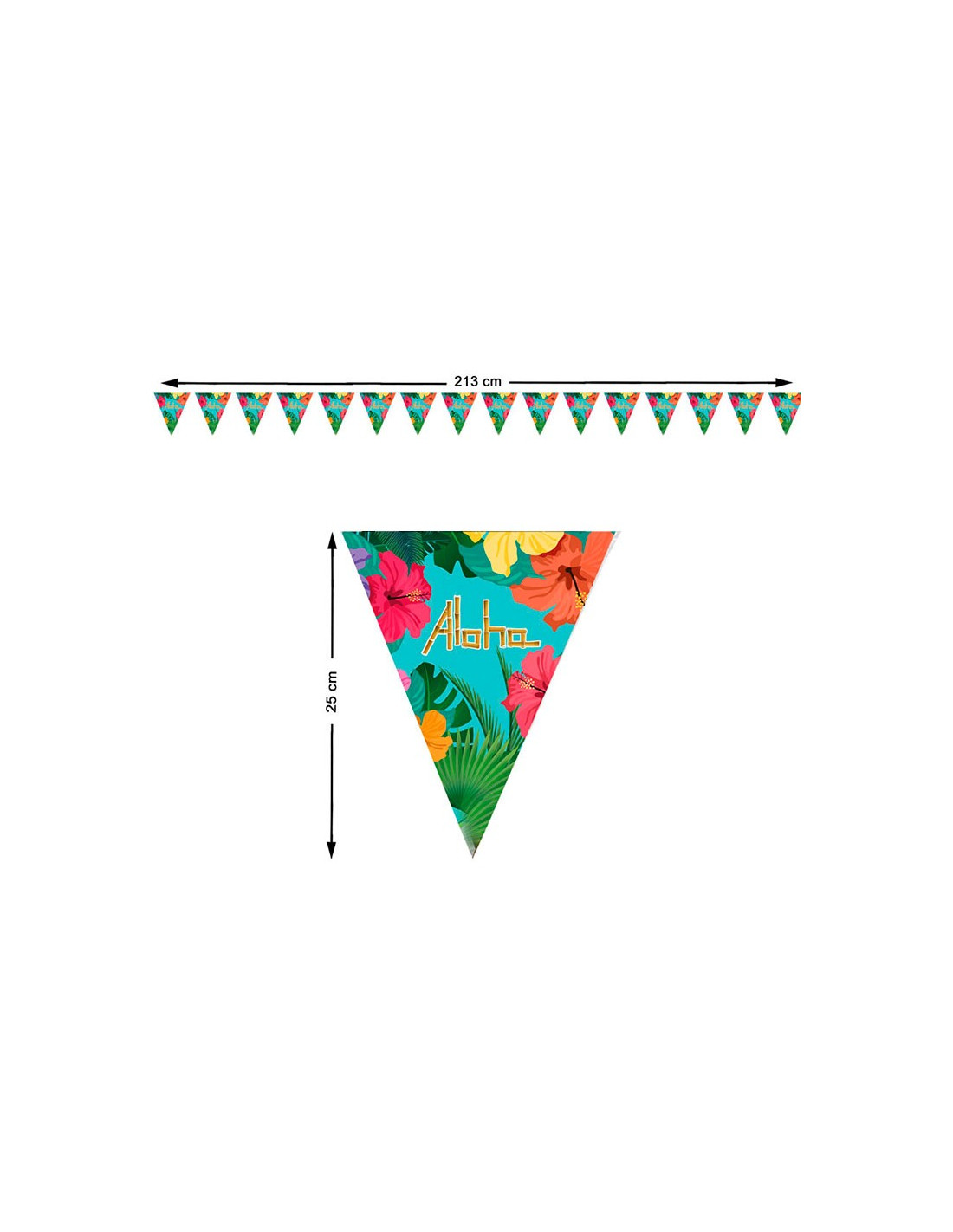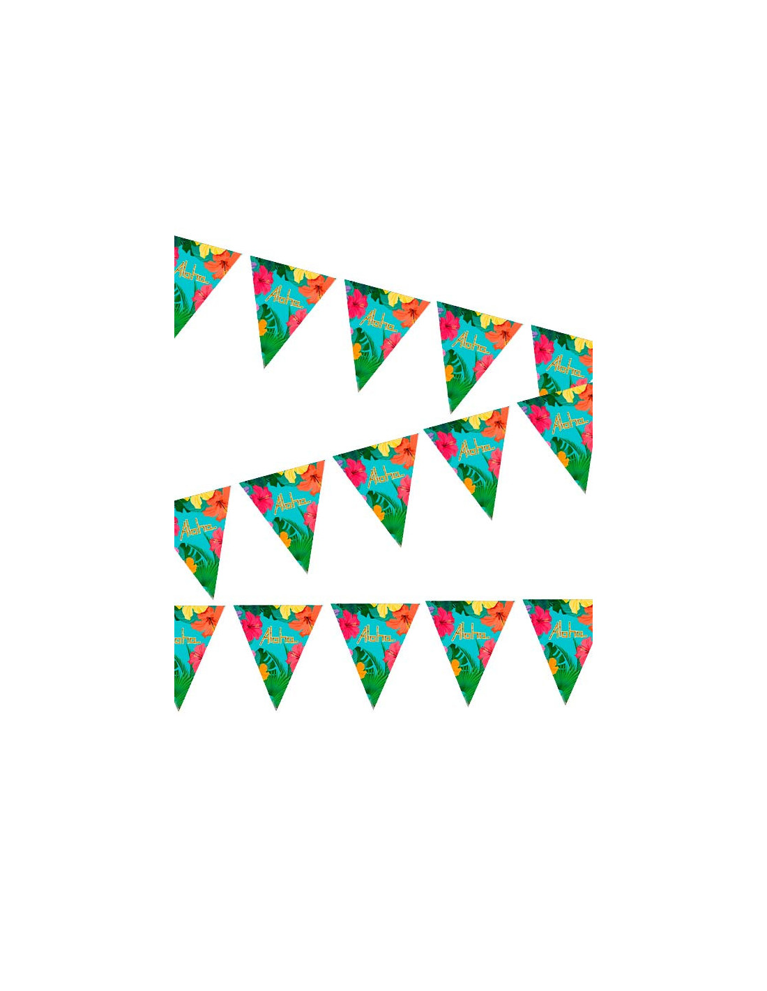 Incluye banderines hawaianos de plástico que mide 213cm de largo. La guirnalda está compuesta por banderines triángulares de 25cm de alto.