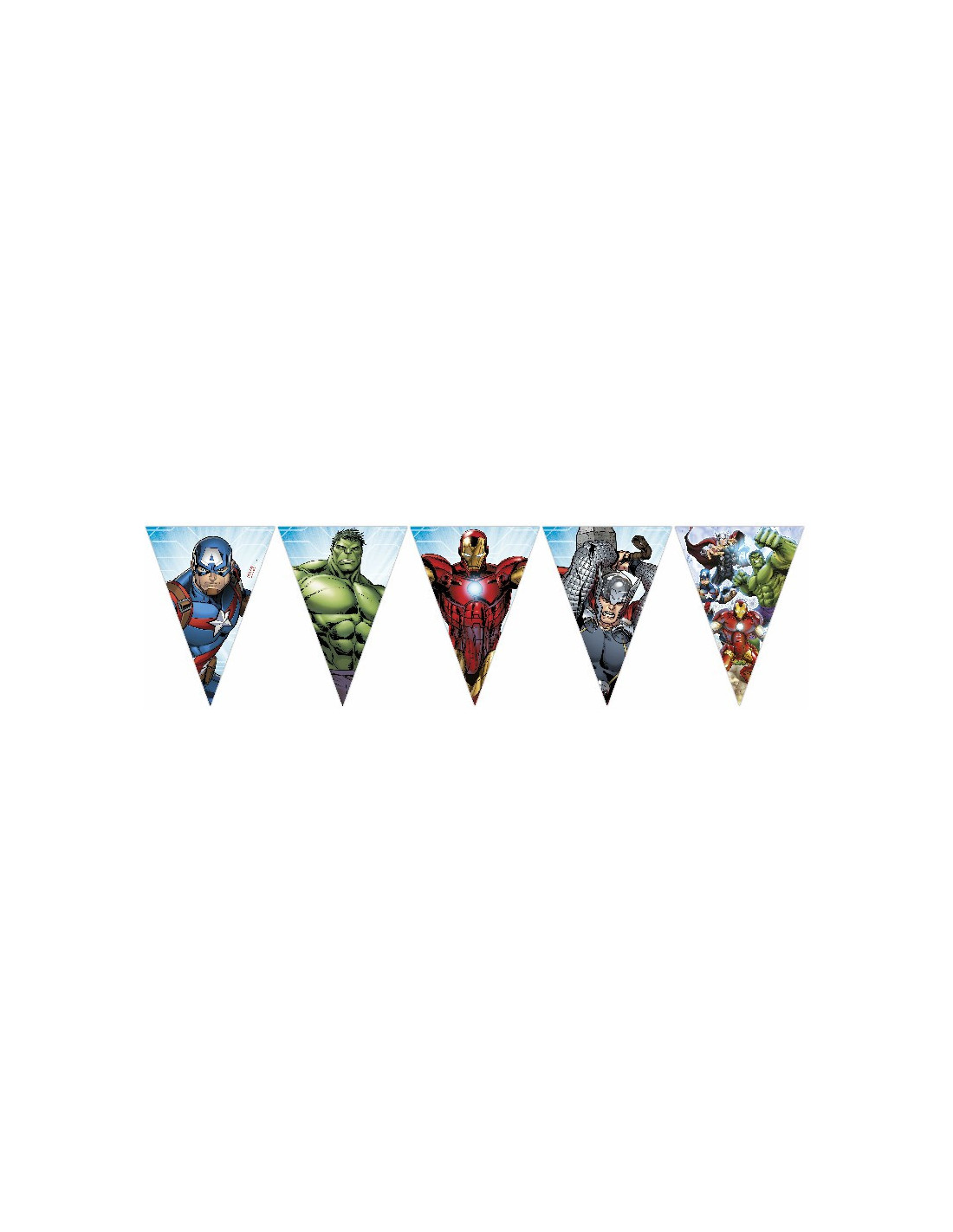 Banderines Los Vengadores que incluye una guirnalda de 2.30m compuesta por 9 banderines de plástico estampados con 30cm de alto.