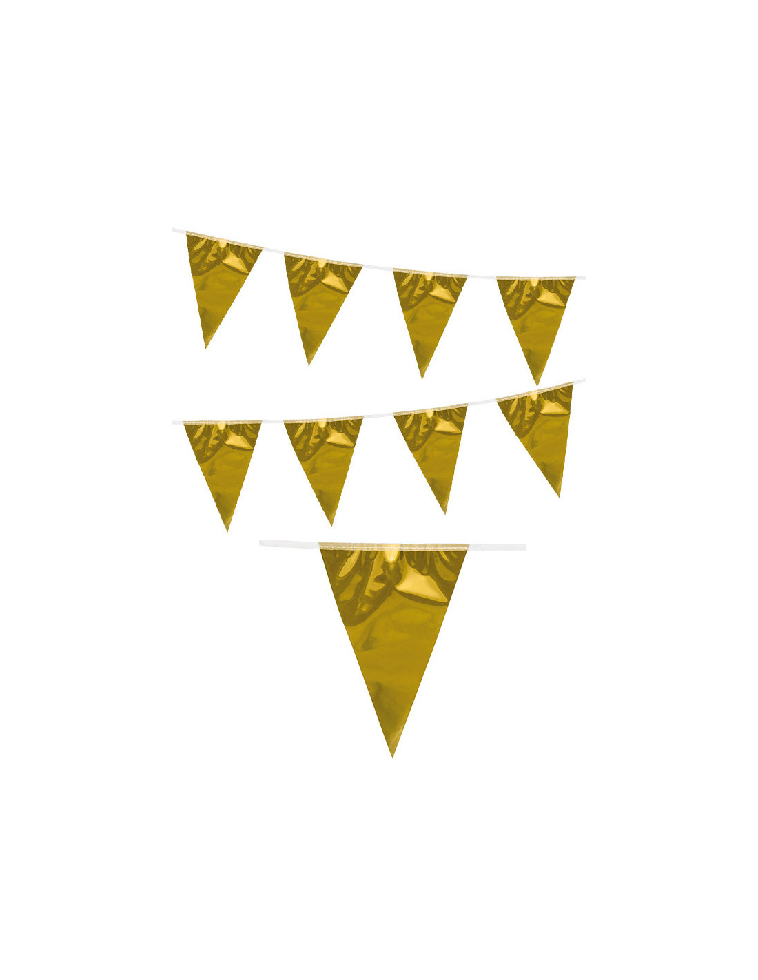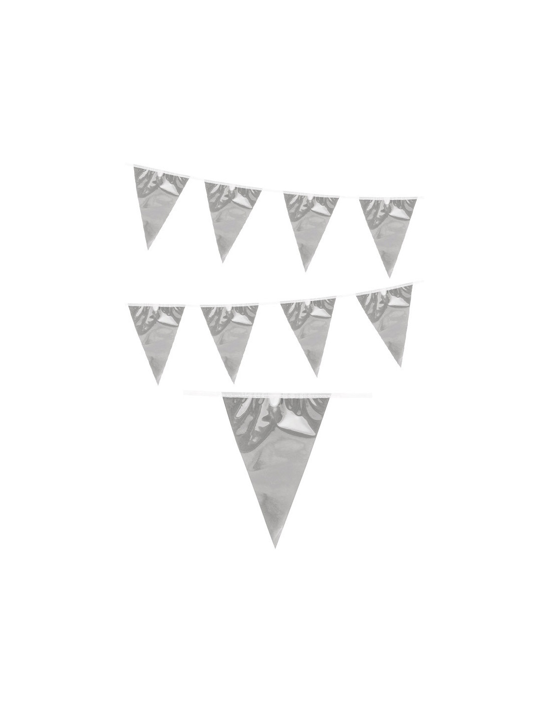 Banderines metalizados que incluye una guirnalda que mide 10m de largo y está compuesta por 18 triángulos de plástico de 45x30cm cada uno.