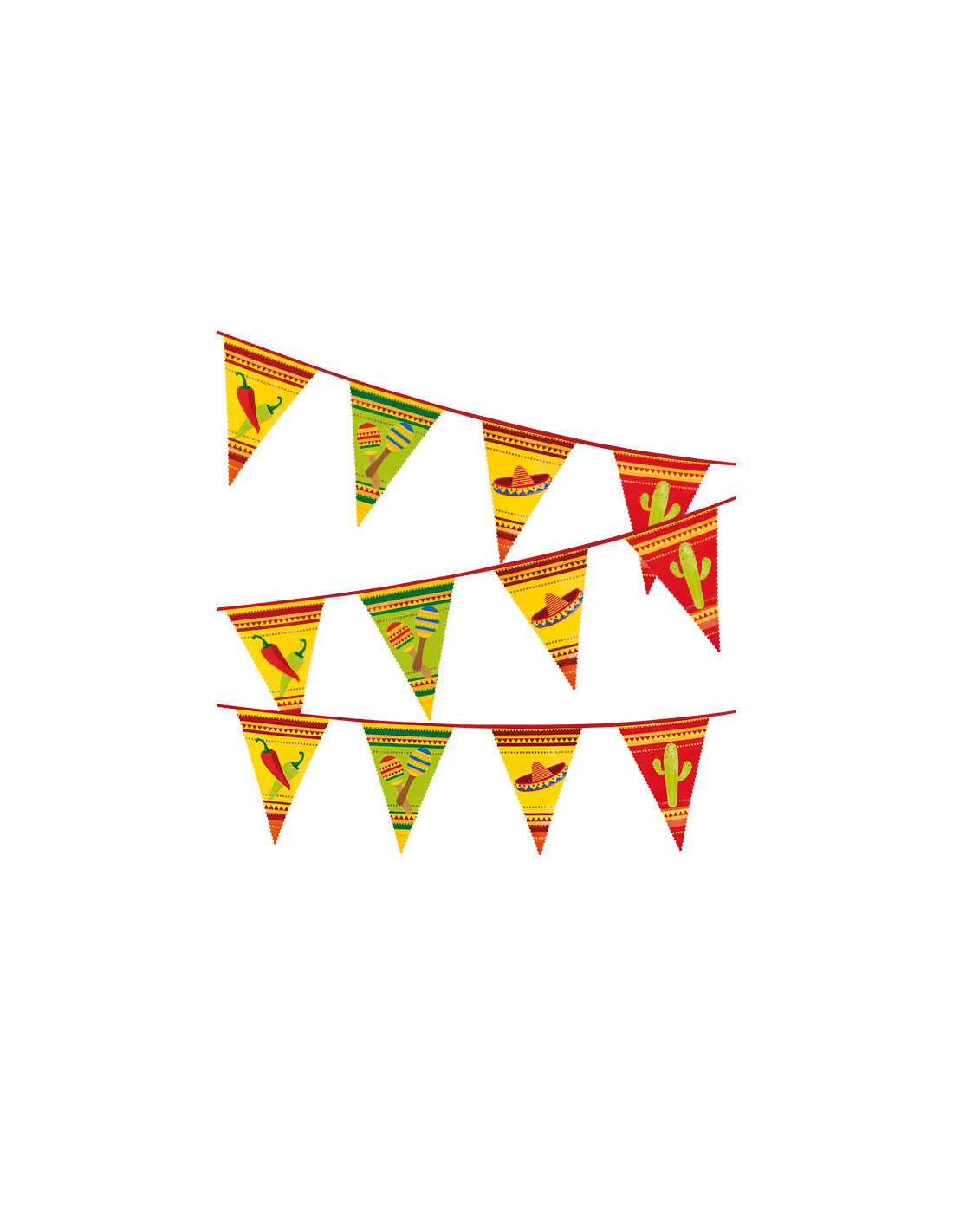 Consta de una guirnalda de 6 metros de largo y banderines de 30x20cm, todos ellos estampados con motivos mejicanos.