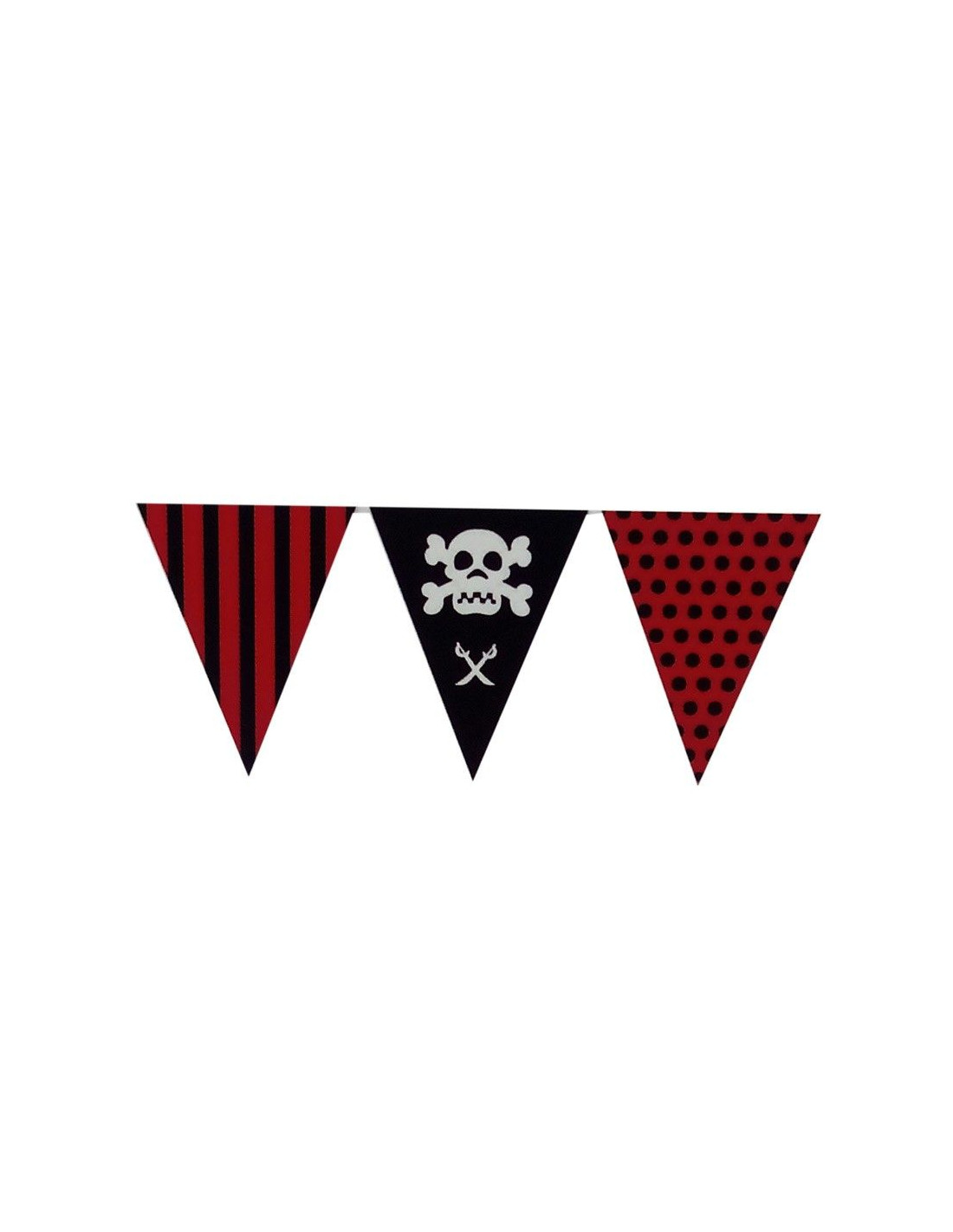 Banderín con forma triangular y motivos piratas. Ideal para fiestas de cumpleaños temáticas. Tiene una medida de 5metros de largo y banderines de 27x23cm.