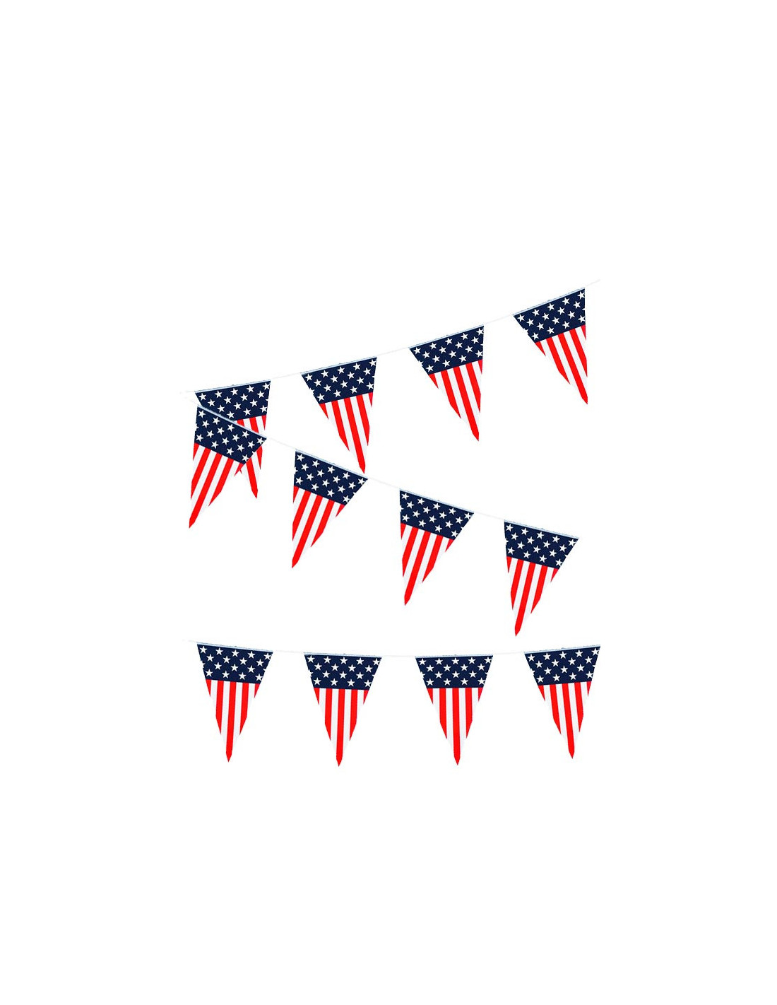 Guirnalda de banderines USA que tiene 6 metros de largo y está formado por triándulos con la bandera de Estados Unidos impresa y un tamaño de 30x20cm.