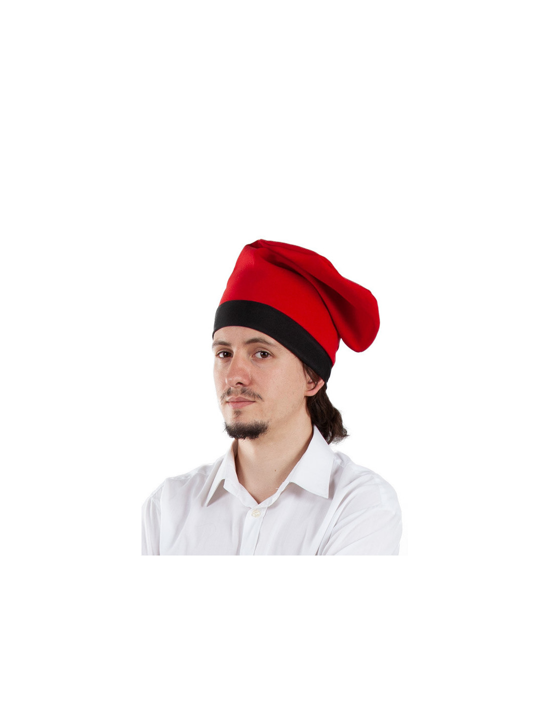 Viste el típico gorro catalán llamado barretina con forma de bolsa y con su característico color rojo y una franja negra alrededor de la cabeza.
