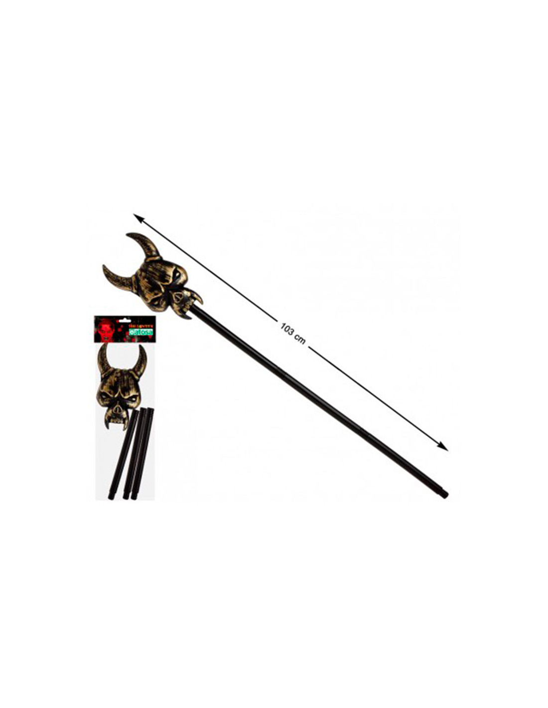Contiene un bastón de plástico que mide 103cm de alto y en su extremo tiene una calavera con cuernos.