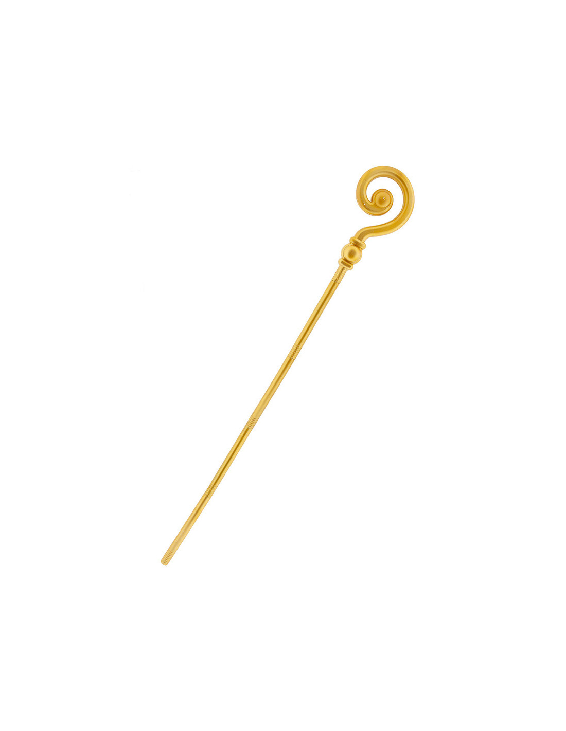 El bastón es de plástico en color dorado y desmontable para ajustar a la altura que mejor te convenga. Mide un máximo de 140cm de alto y 18cm de ancho en el decorado de la parte superior.