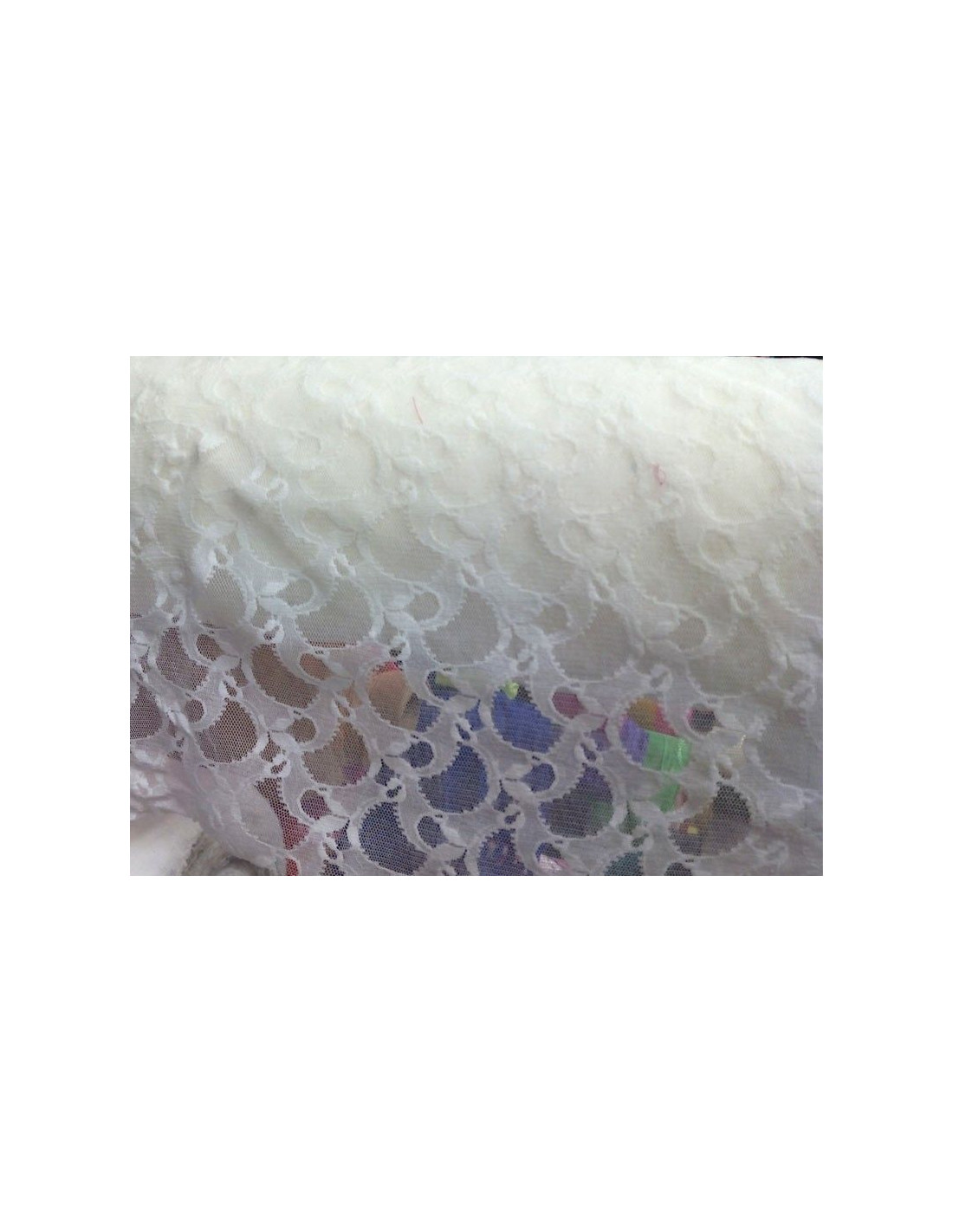 Blonda elástica blanca con dibujos bordados y con unas dimensiones de 150cm de anchura. Se vende por metros. Compra mínima 1m.