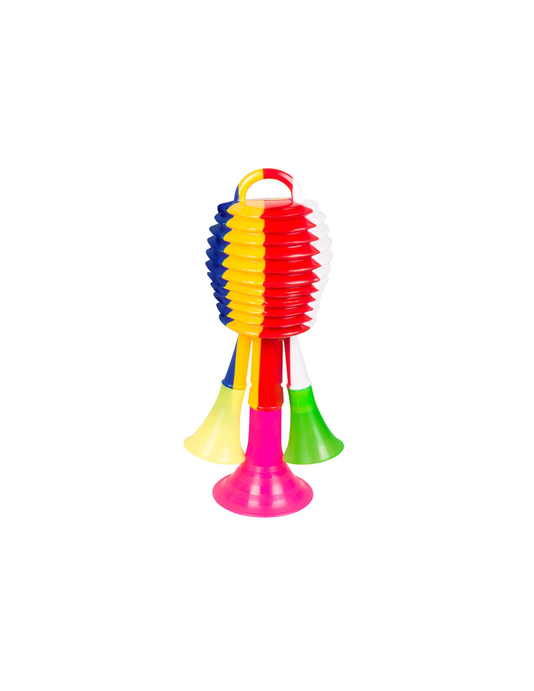 Te oirán llegar desde todas partes con esta colorida bocina triple de payaso. Es perfecta para eventos deportivos o como accesorio para tu disfraz.