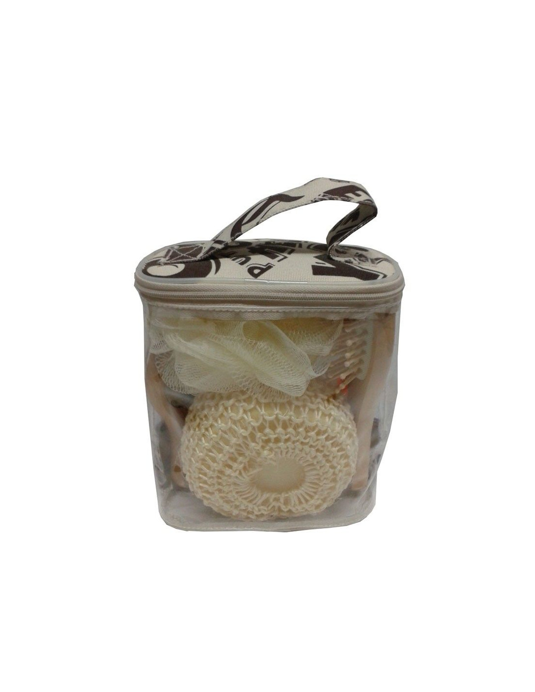 Medidas 16x15x6cm, incluye dos esponjas, espejo y cepillo de pelo.