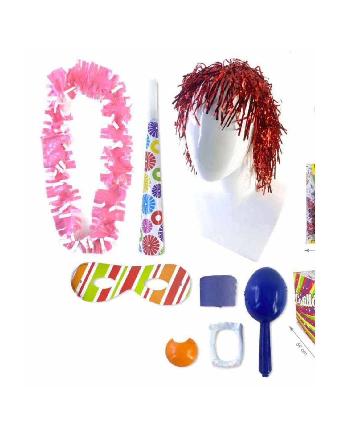 Bolsa de cotillón que incluye, collar, trompeta, peluca, antifaz, nariz, serpentina de 5 rollos, dentadura y maraca.