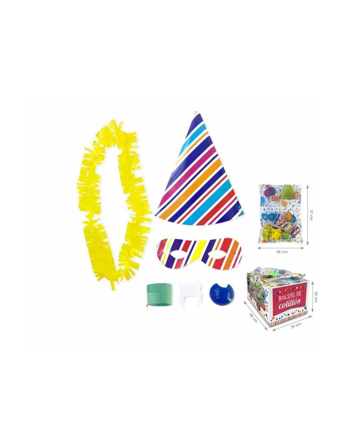 Bolsa de cotillón que incluye, un  collar de plástico, gorrito, antifaz, serpentina de 5 rollos, dentadura, nariz.
