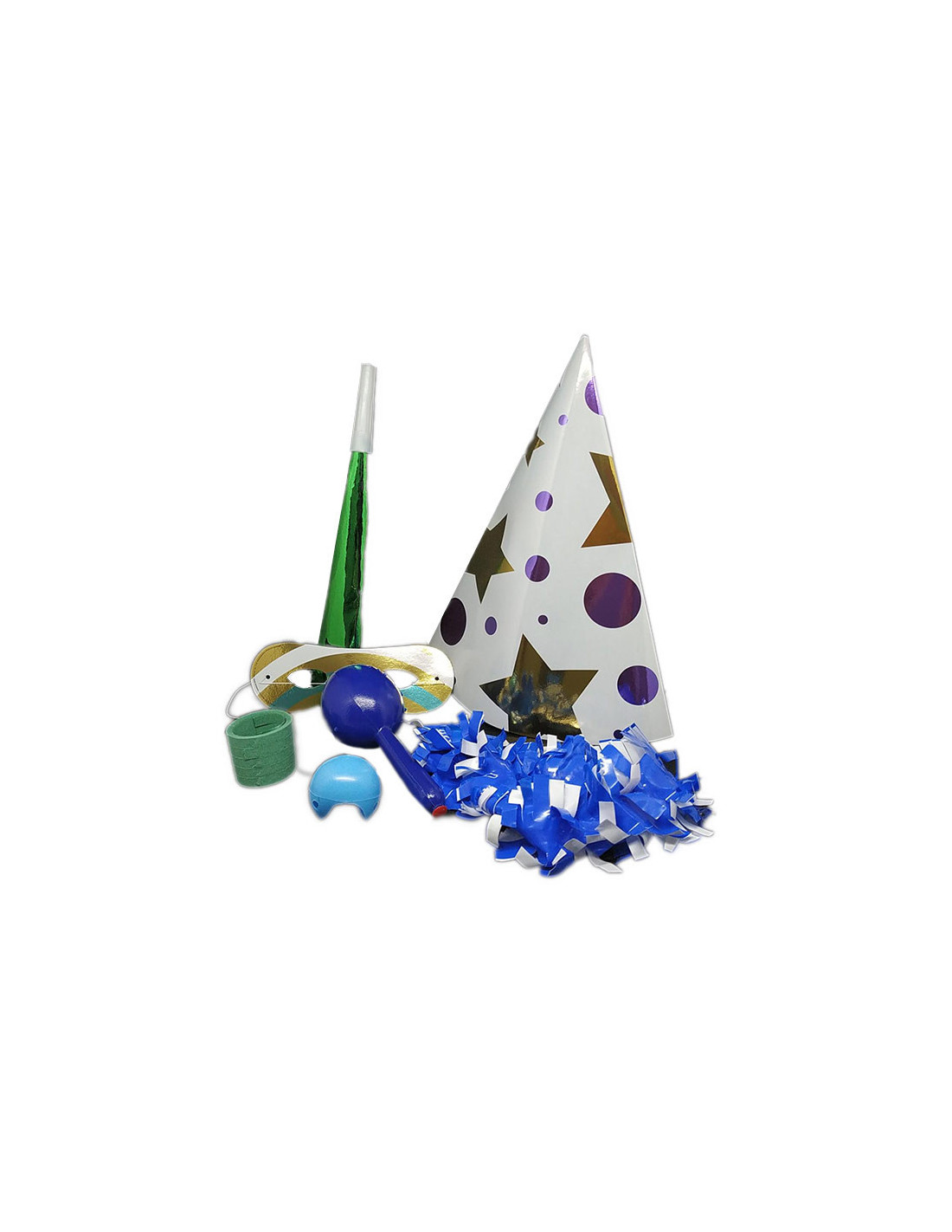 Cada bolsa contiene un gorro de cartón estampado, un antifaz de cartulina estampada con goma elástica, trompeta de cartón, serpentina, maraca de plástico, nariz de payaso de plástico y collar. El contenido es aleatorio y los estampados y colores pueden variar de los que aparecen en la imagen.