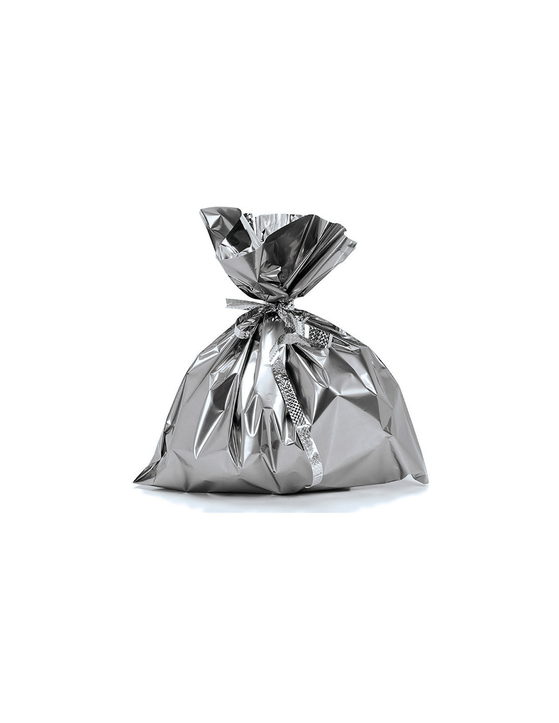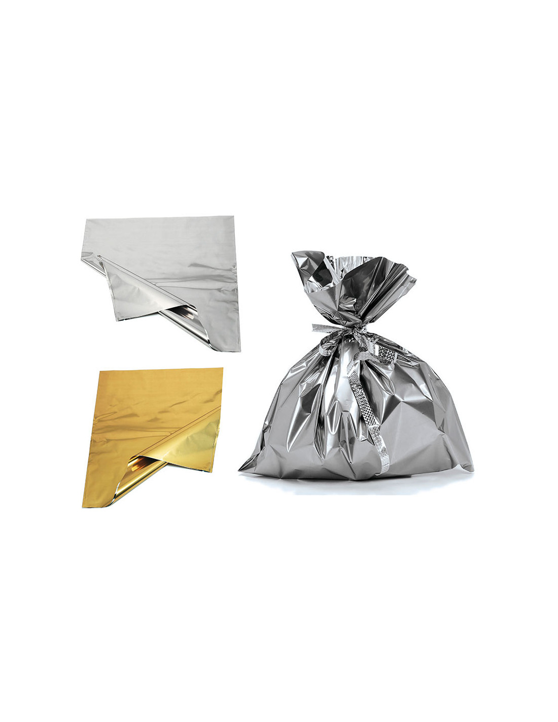 Contiene una bolsa metalizada en color oro o plata que mide 40x55cm aproximadamente.