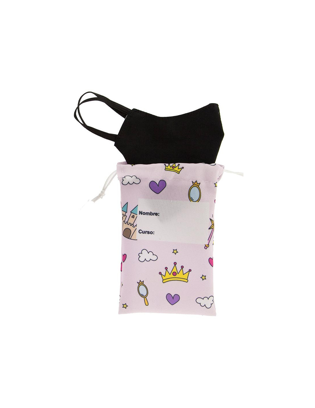 Bolsa para mascarillas princesas para que los peques lleven siempre consigo una mascarilla de recambio en el cole.  Estampado con motivos de princesas tenemos disponible la mascarilla a juego. En la bolsa de tela hay un espacio en blanco para escribir el nombre y curso del pequeño o pequeña por si pierde la bolsita.