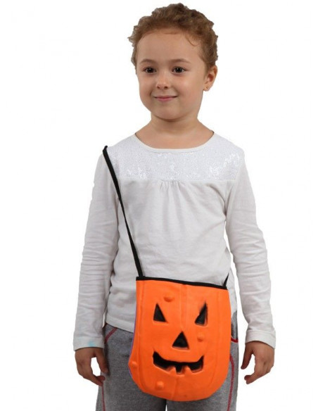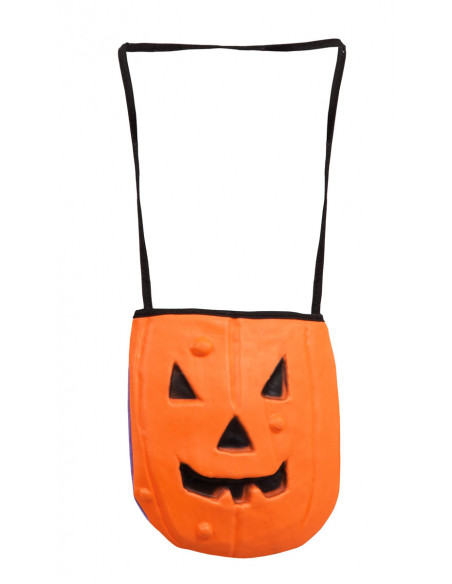 Bolso de calabaza para Halloween con delantera de goma eva con forma de calabaza y trasera de tela. Ideal para recoger calameros en Halloween.